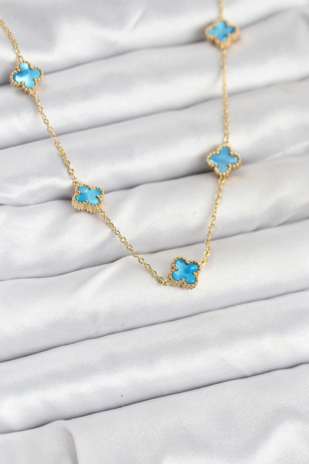 316L Çelik Zincir Gold Renk Buz Mavisi Baby Boy Yonca Kadın Kolye