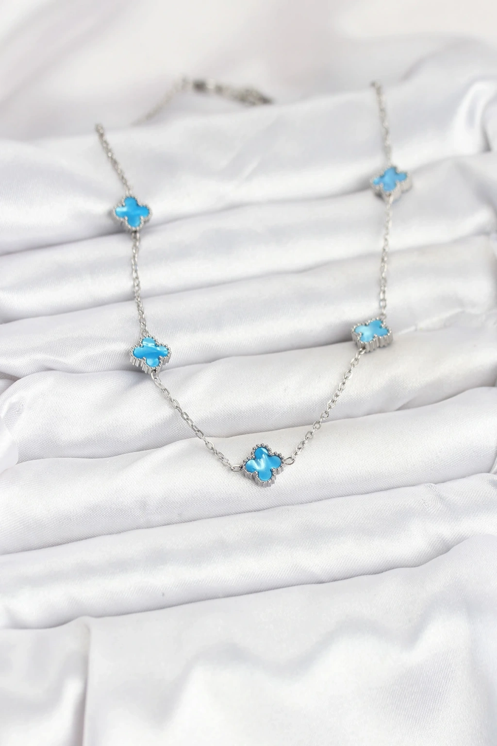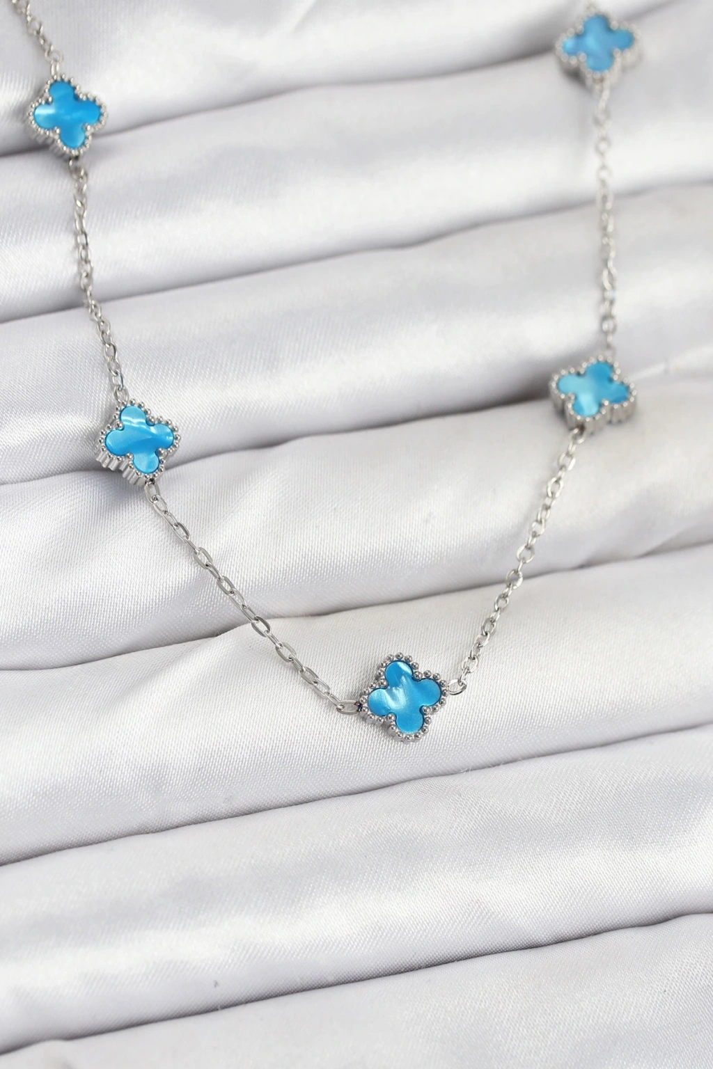 316L Çelik Zincir Gümüş Renk Buz Mavisi Baby Boy Yonca Kadın Kolye