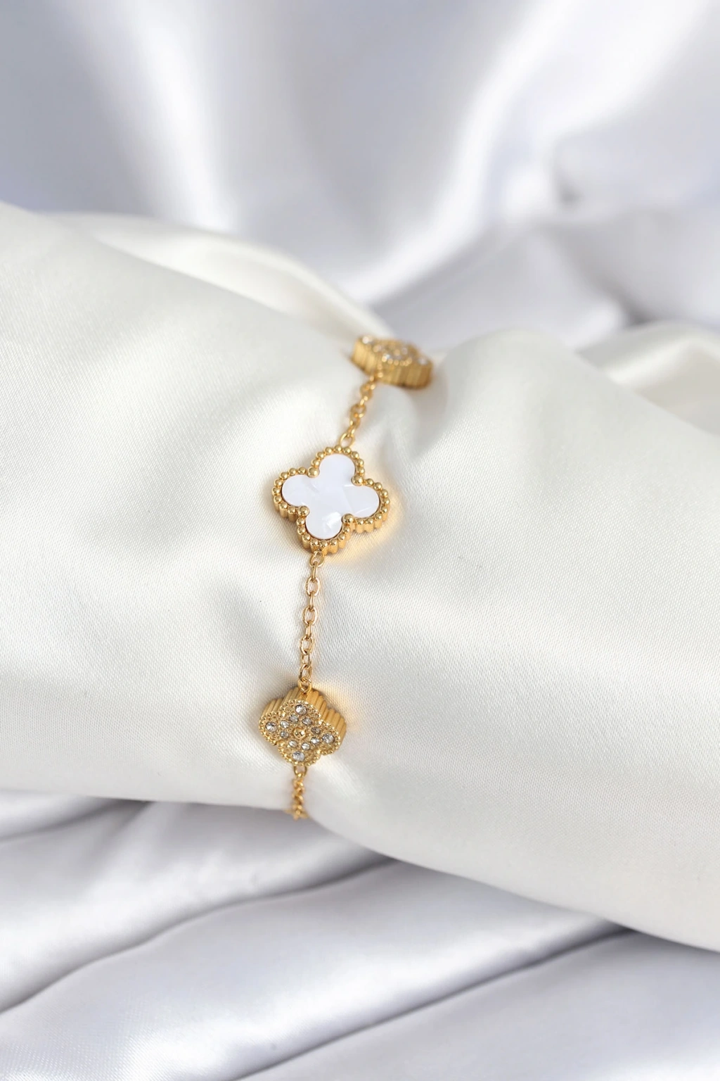316L Çelik Zincir Zirkon Taşlı Yonca Beyaz Kadın Bileklik