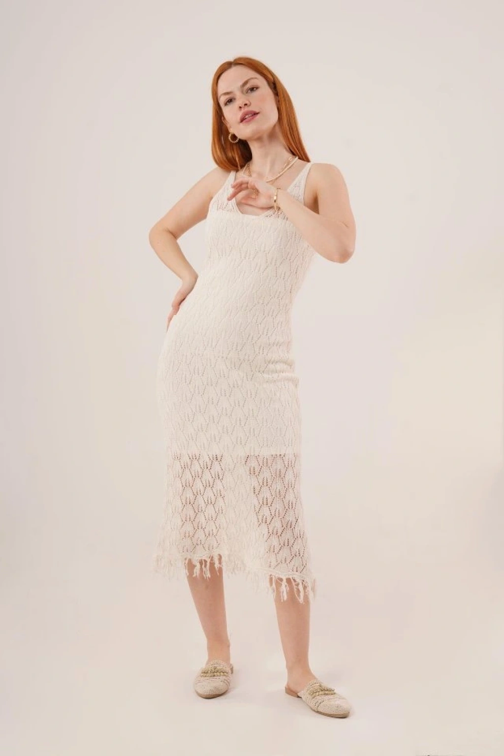 Ajurlu V Yaka Püskül Detaylı Krem Elbise