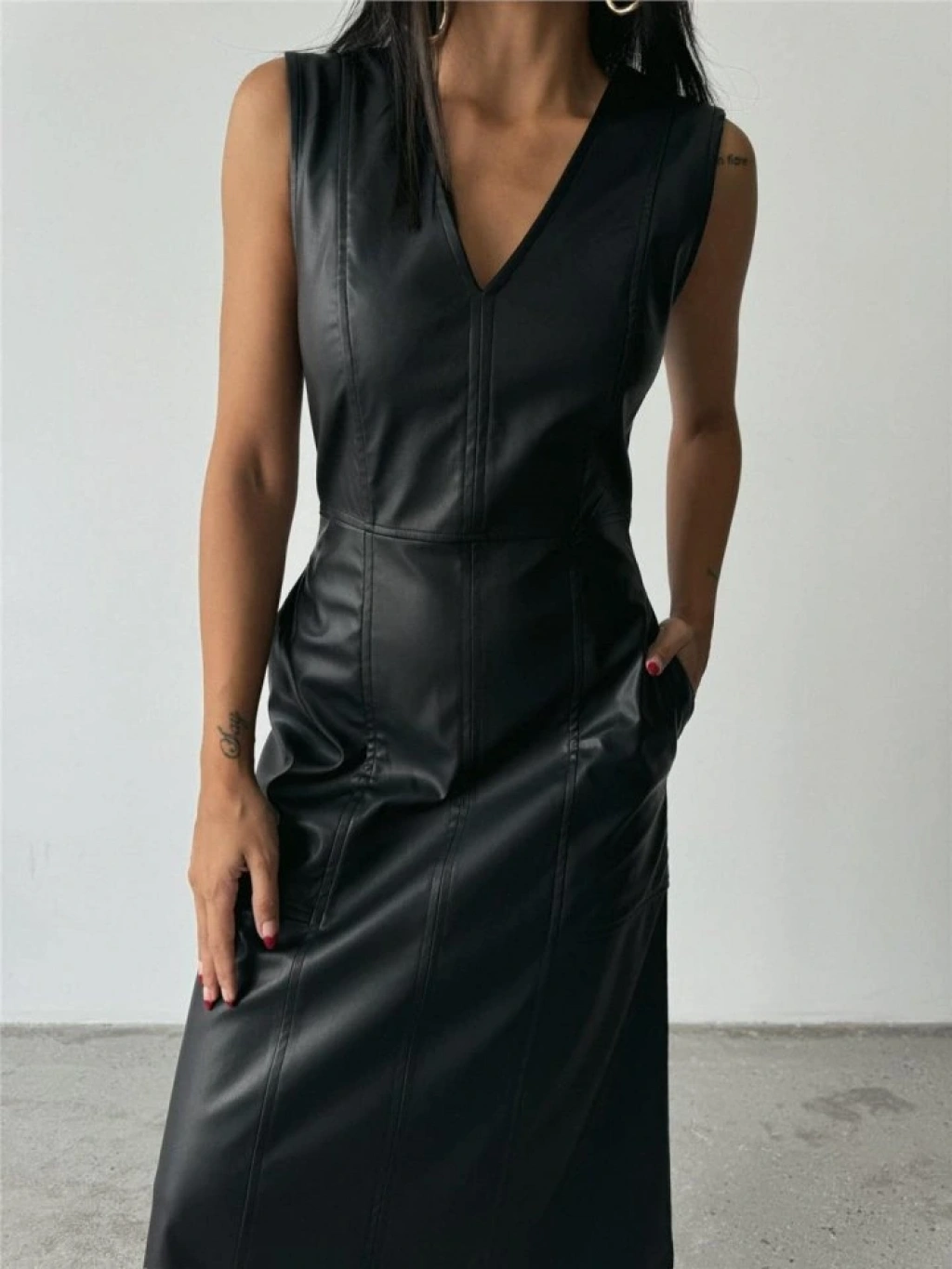 ASKILI DERİ ELBİSE ŞANEL BOY - Siyah