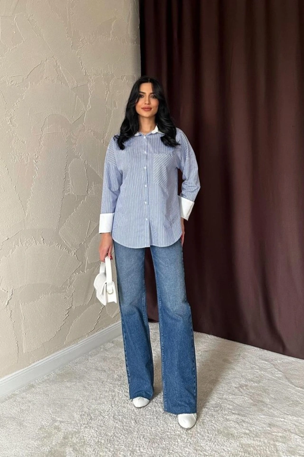 Mavi Çizgili Poplin Uzun Kol Gömlek