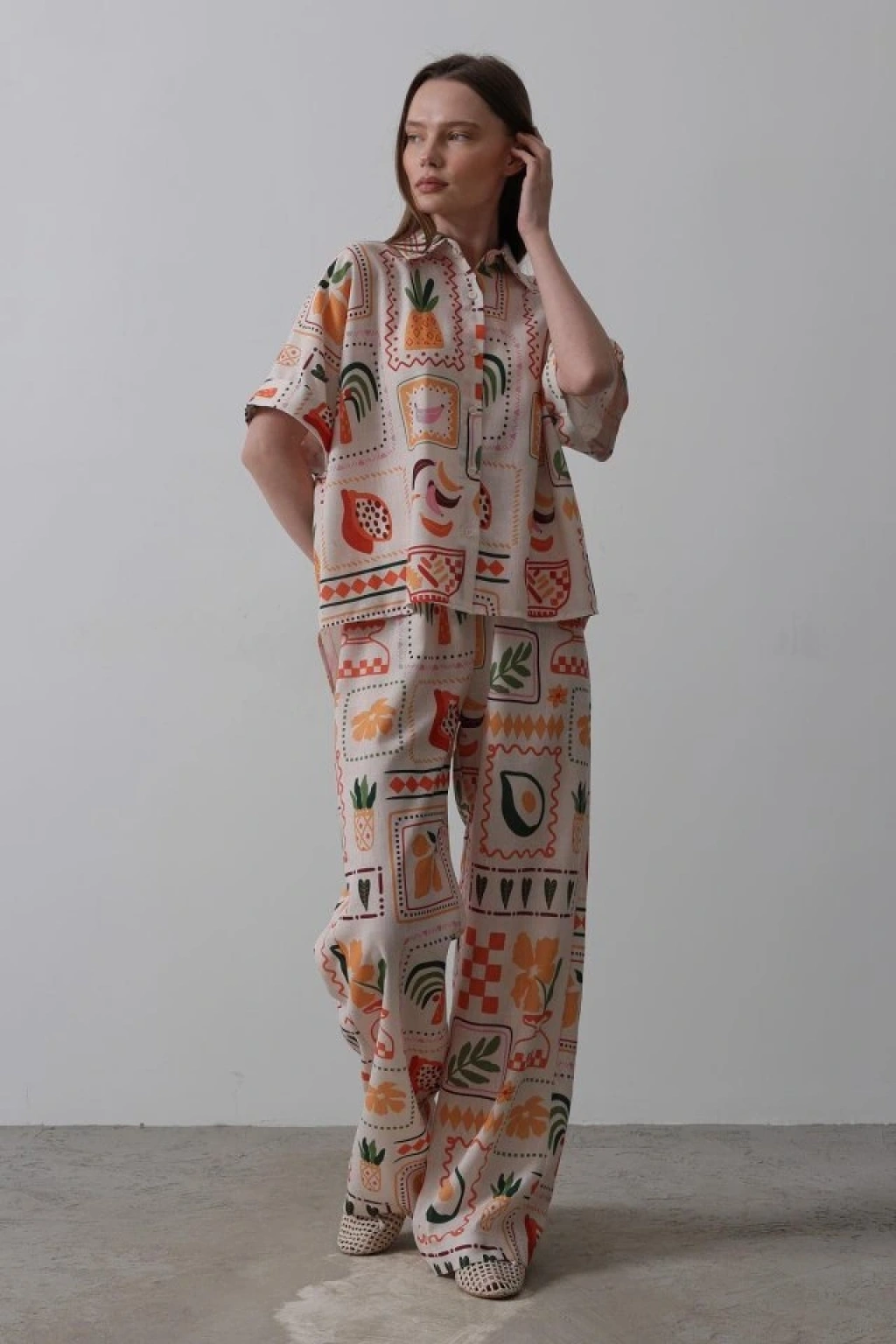 Baskılı Kısa Kol Pantolon Takım - Taş-Oranj
