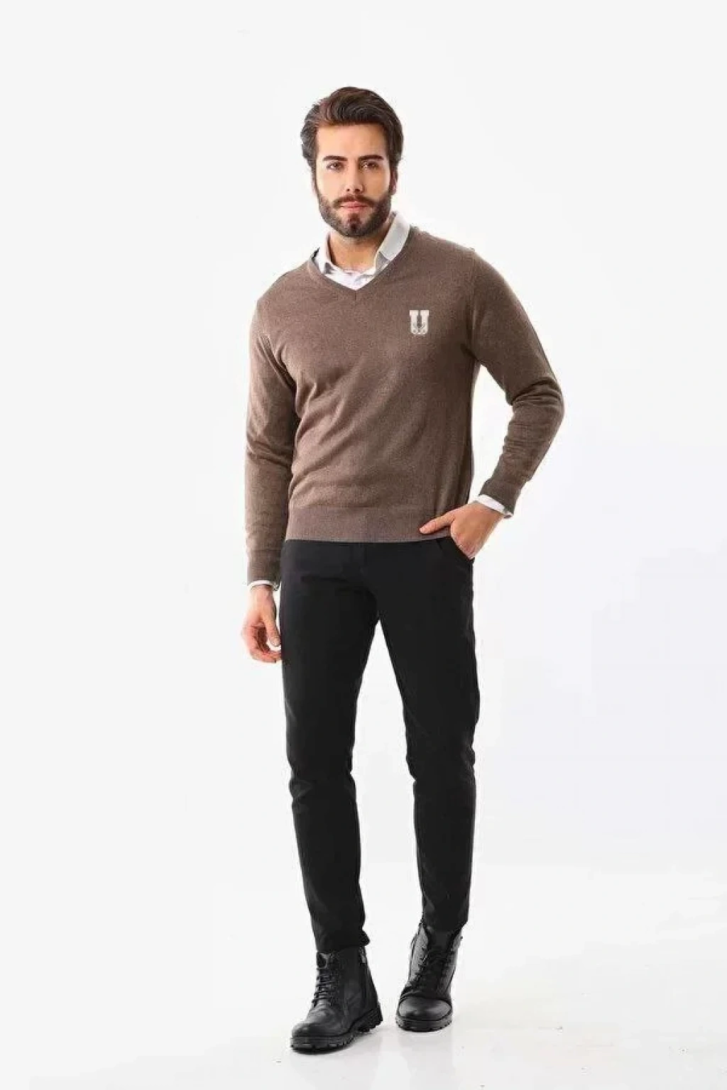 Baskılı V Yaka Uzun Kol Dokuma Triko Kahve