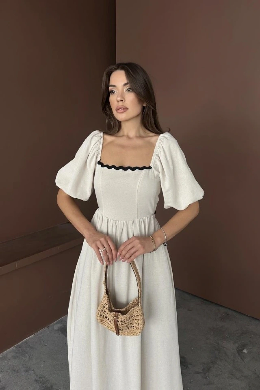 Bej Arkası Bağlamalı Keten Elbise