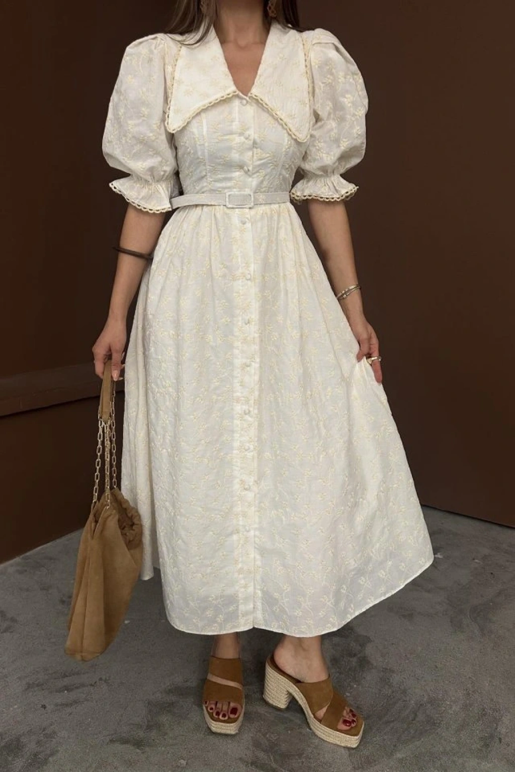 Bej Bebe Yaka Balon Kollu Brode Elbise