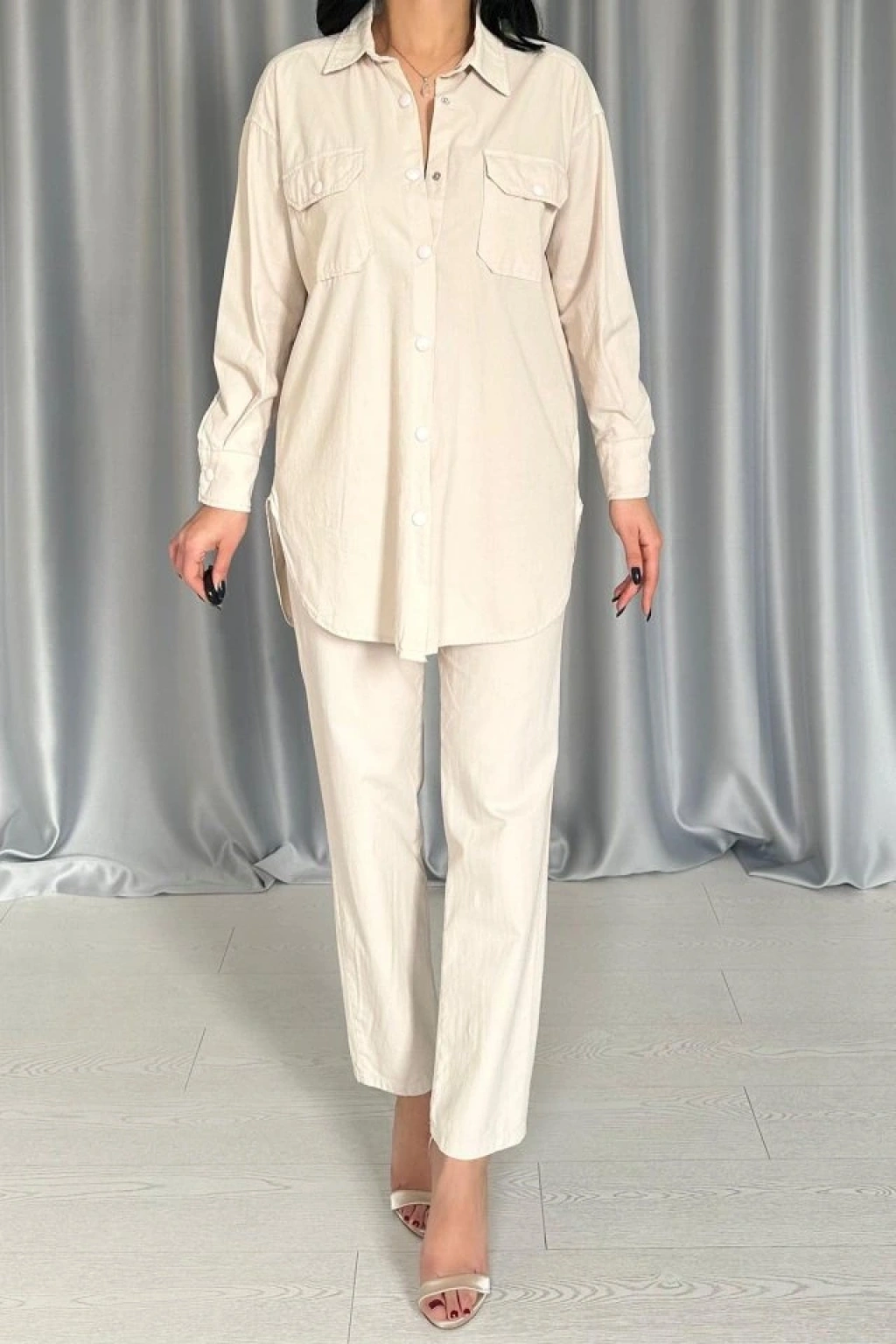 Bej Gömlek Ve Çıtçıtlı Pantolon Takım