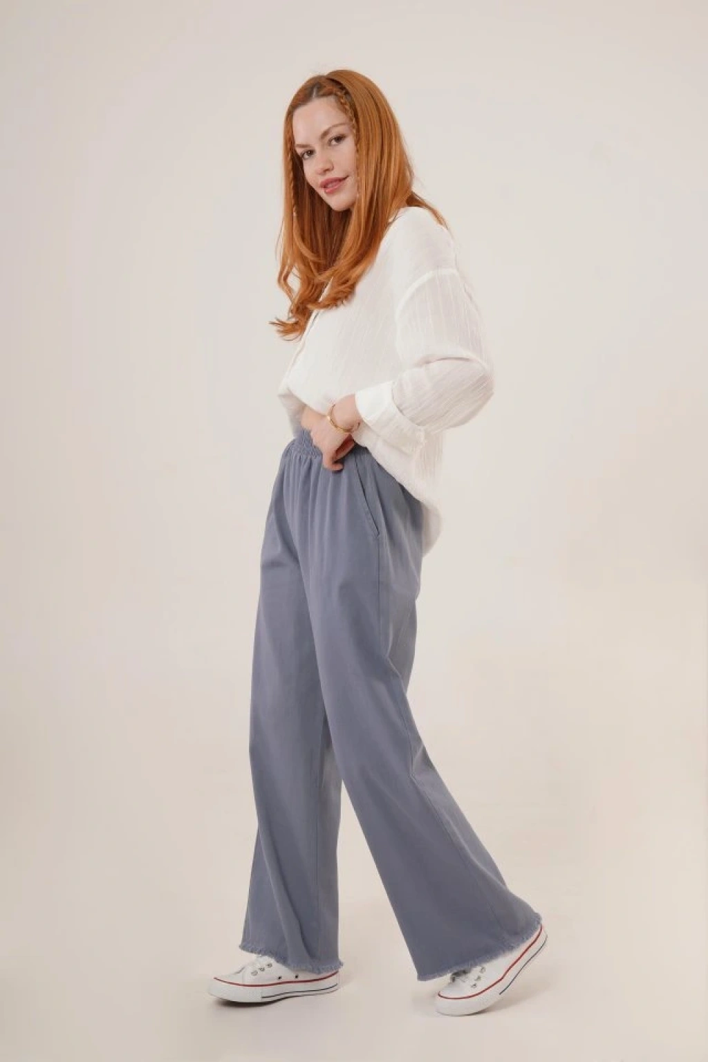 Bel Lastikli Paça Detaylı Cepli İndigo Pantolon