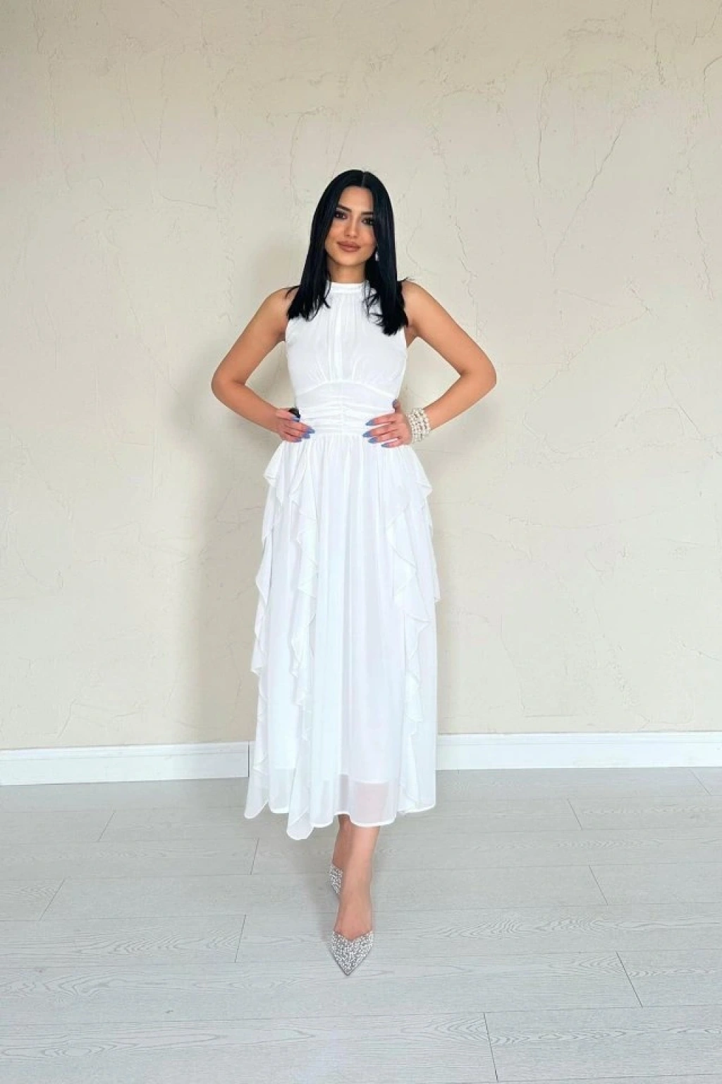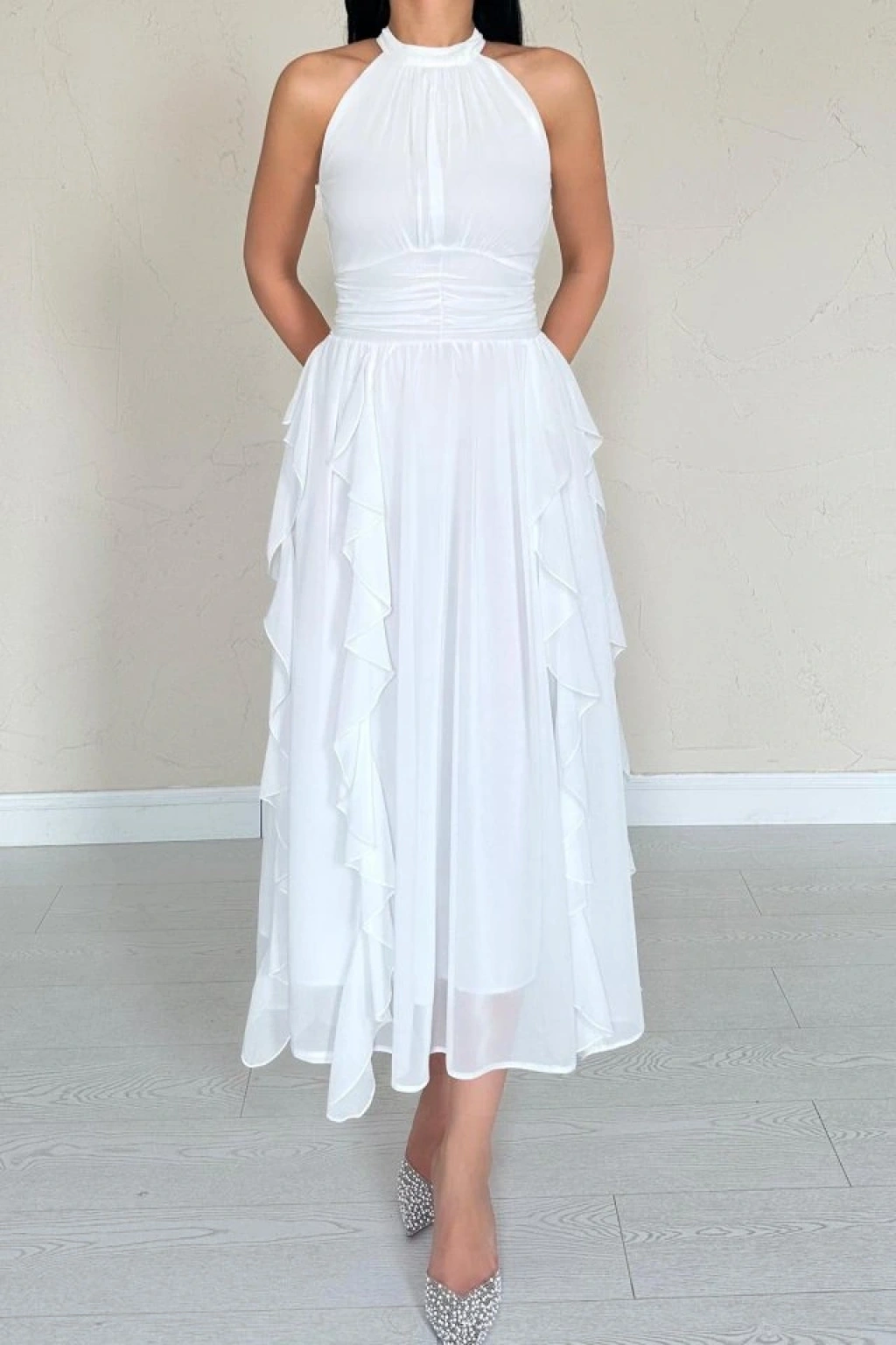 Beyaz Önü Büzgülü Fırfırlı Elbise