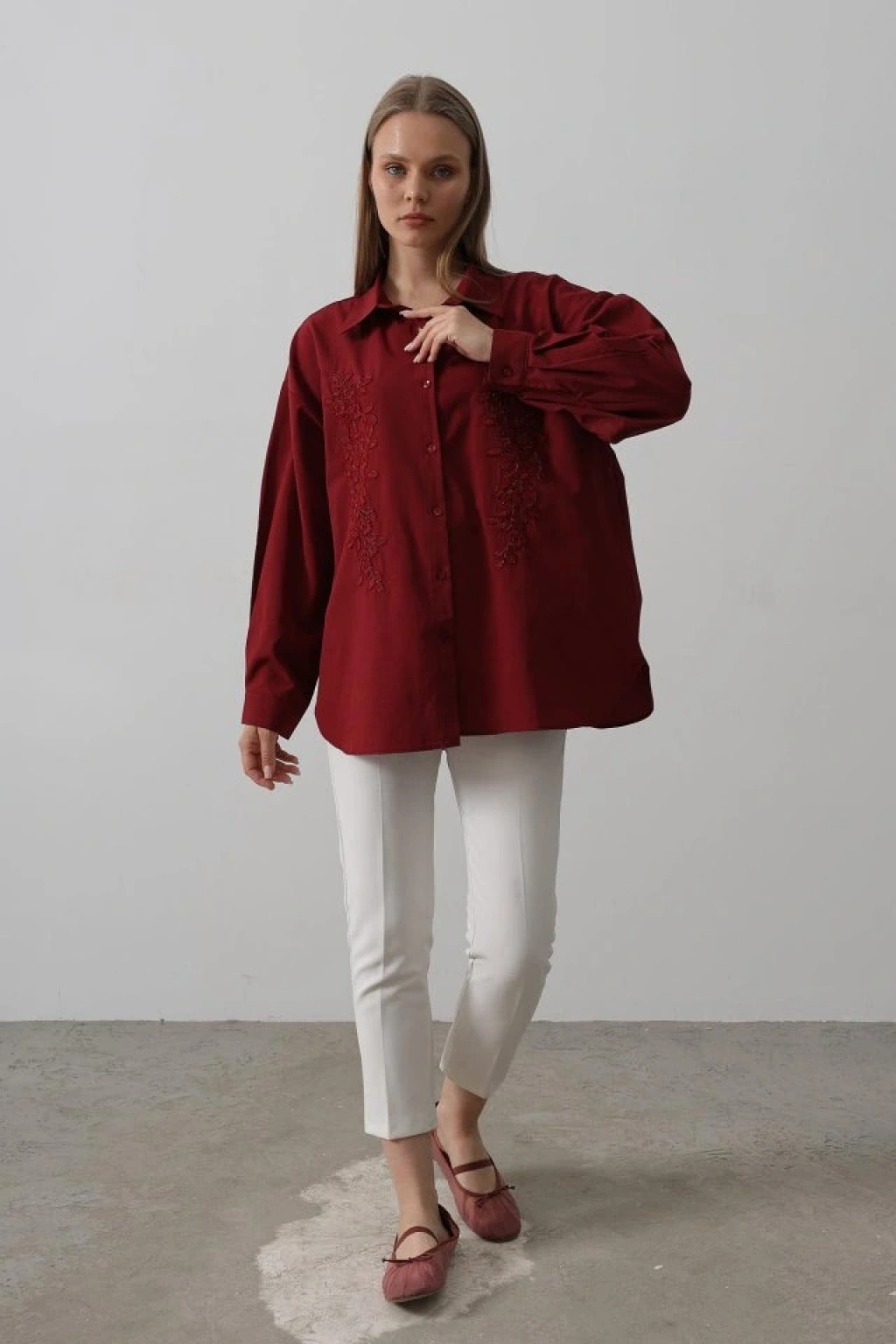 Boncuk Nakış Detaylı Uzun Gömlek - Bordo