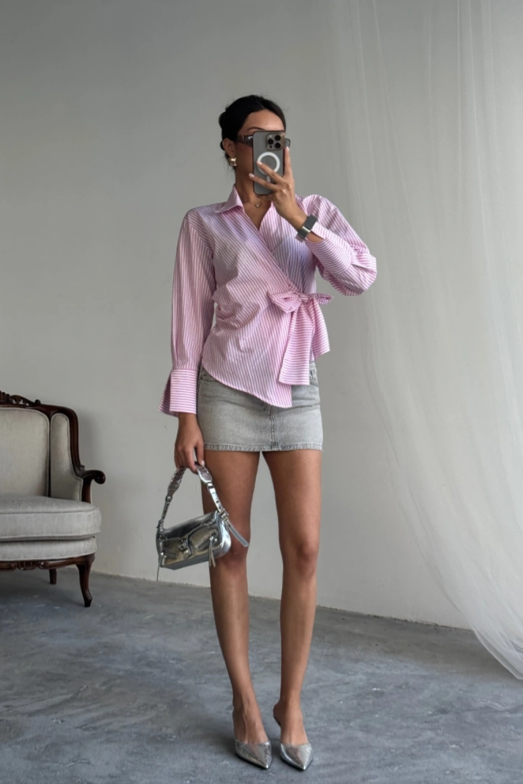 ÇİZGİLİ POPLİN KRUVAZE BAĞLAMALI GÖMLEK - Pembe