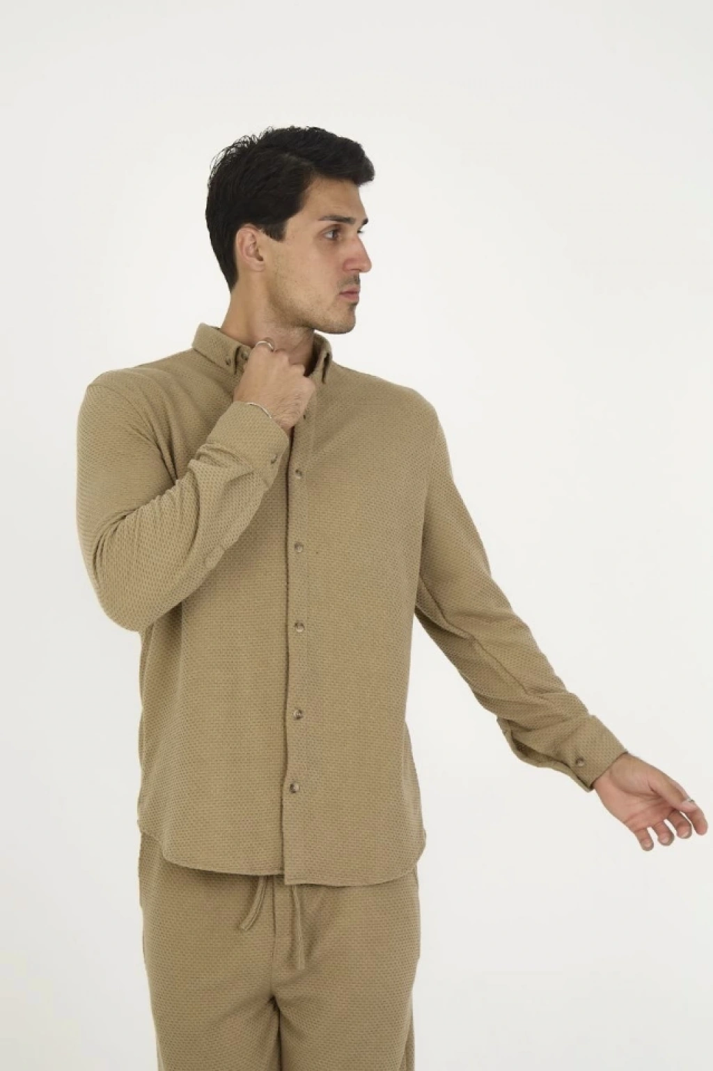 Düğmeli Tam Kalıp Uzun Kol Jakar Gömlek Kahverengi