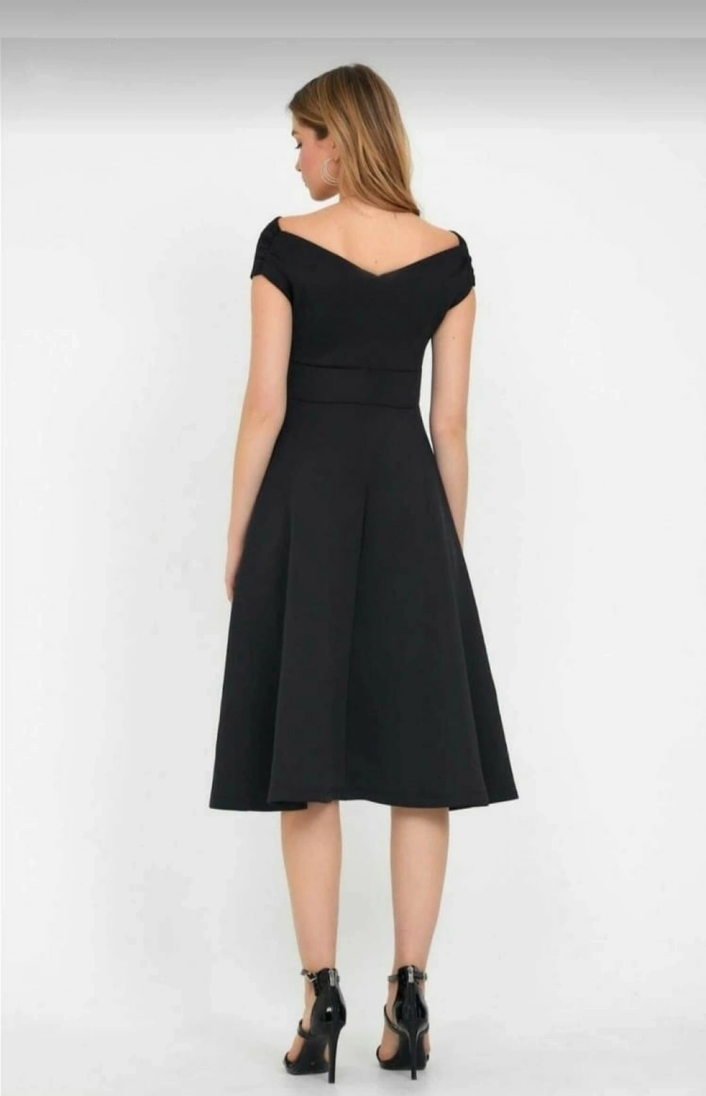 Düşük Omuz Eteği Pileli Krep Kumaş Midi Boy Elbise