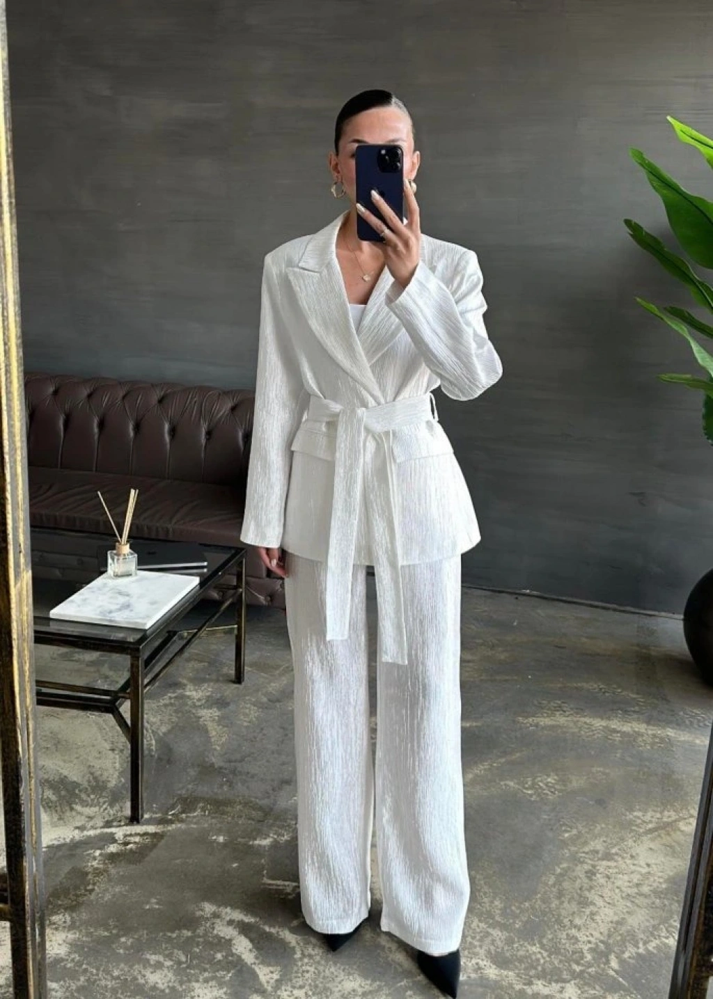 Ekru Beli Kuşaklı Ceket Ve Pantolon Parlak Takım