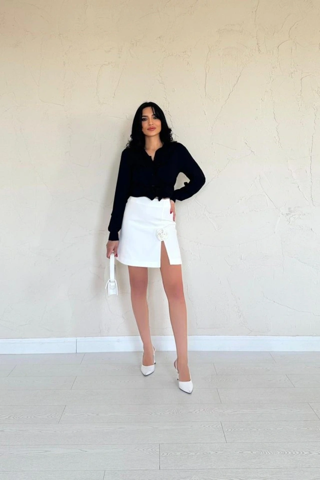 Ekru Yırtmaçlı Gül Detaylı Mini Etek