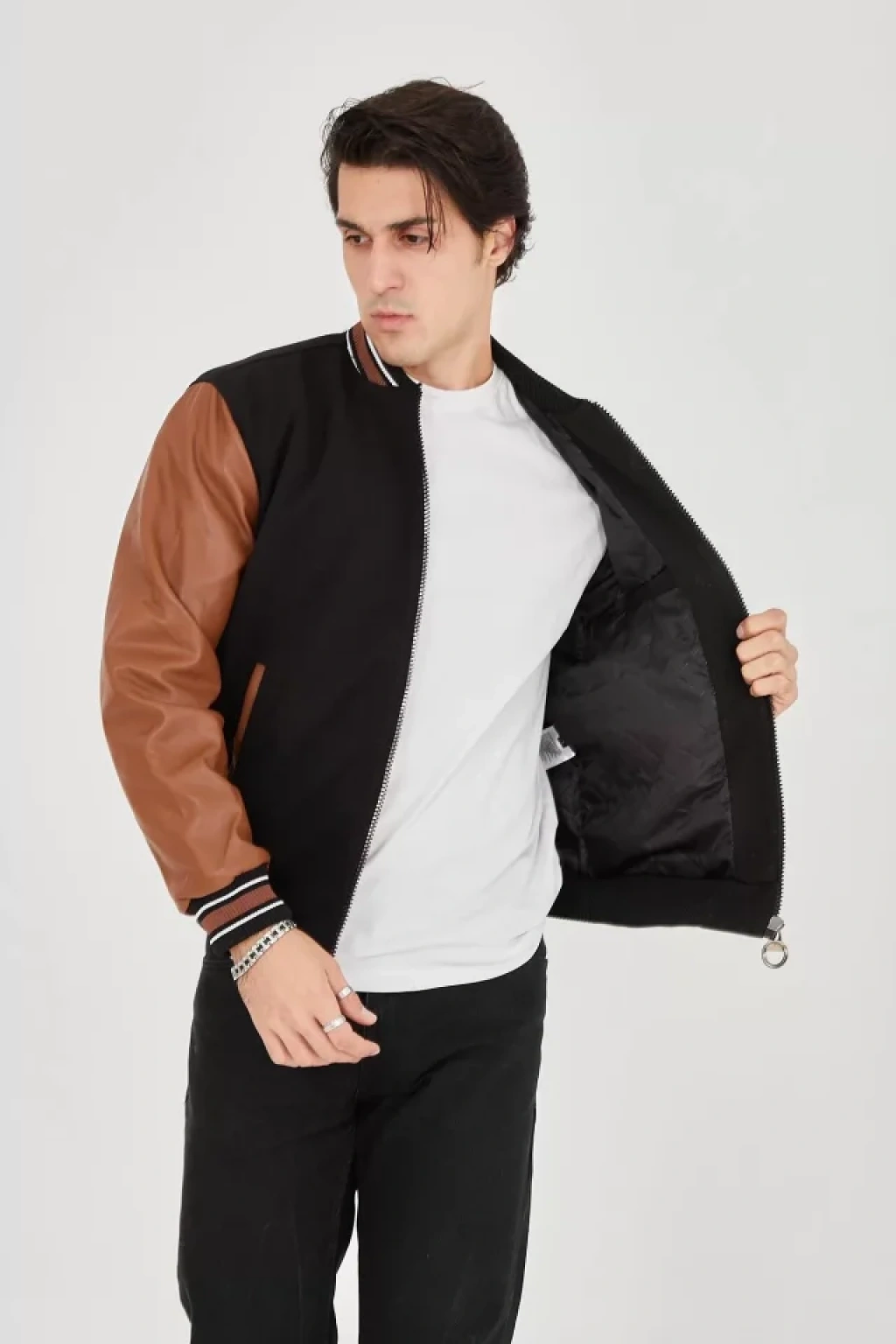 Erkek İçten Elyaf Ve Astarlı Kolları uni Deri Ceket Kahverengi