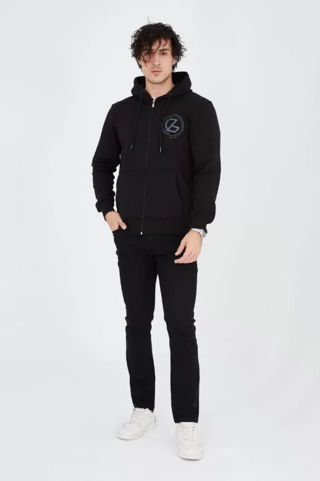 Erkek Kapüşonlu Düz Fermuarlı Hırka iyah