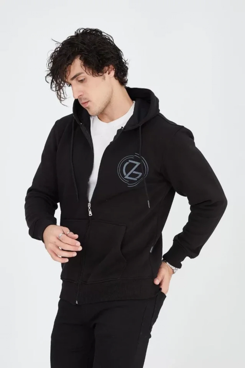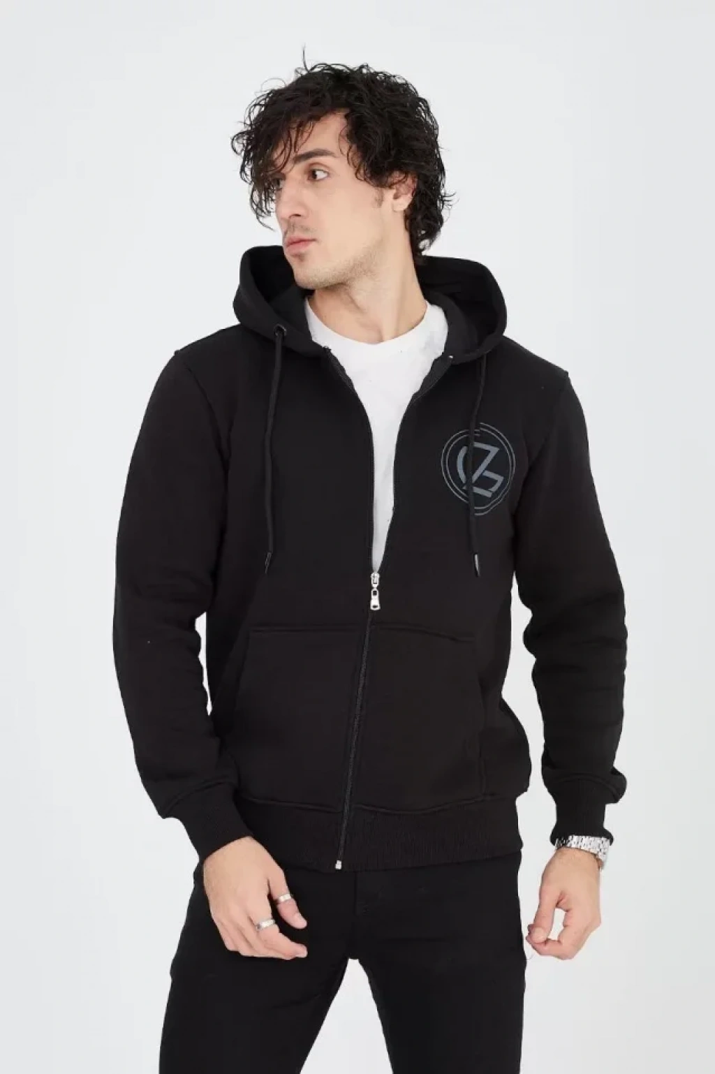 Erkek Kapüşonlu Baskılı Fermuarlı Hırka iyah
