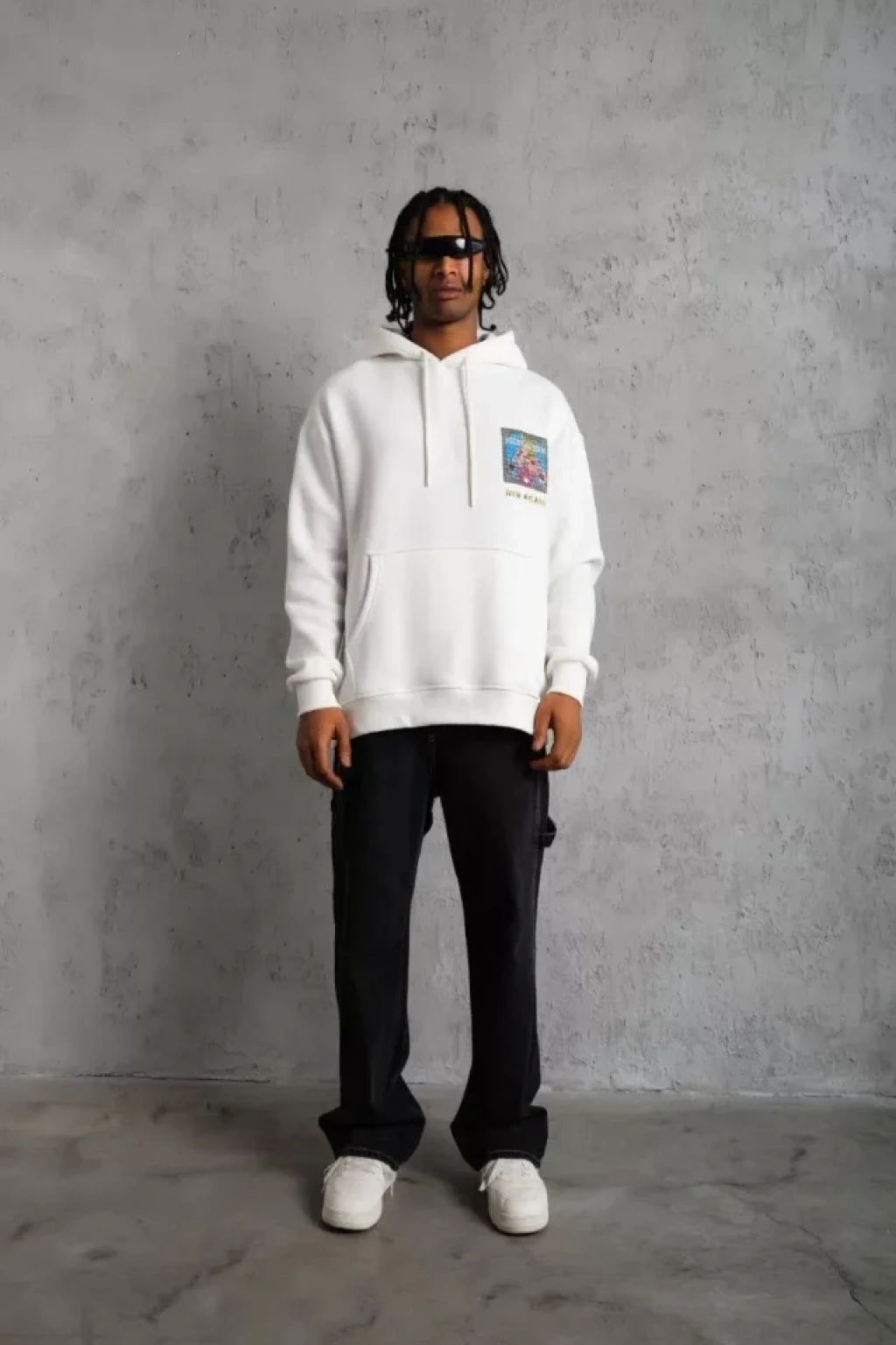 Erkek Üç İplik Baskılı Kapüşonlu weat Beyaz