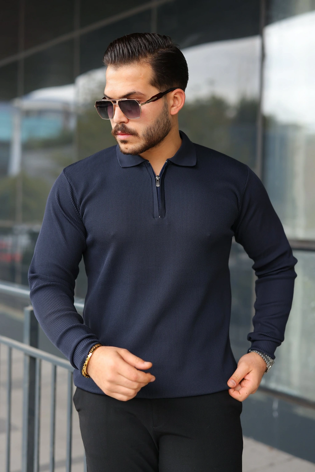 Erkek Fermuarlı Bisiklet Yaka Dokulu Uzun Kollu Triko