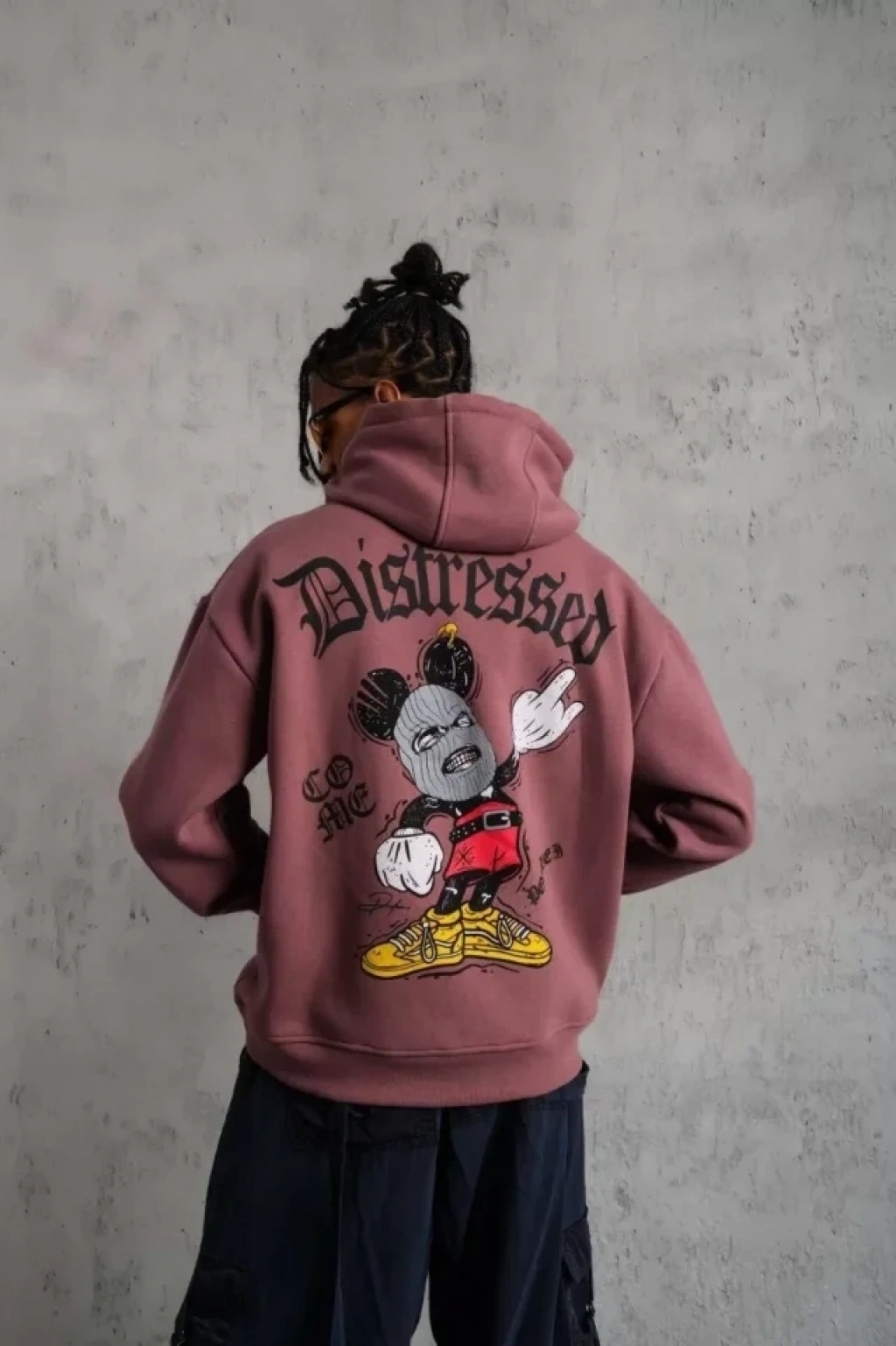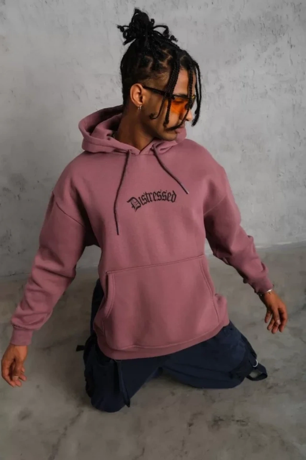 Erkek Üç İplik Baskılı Kapüşonlu weat Gül Kurusu