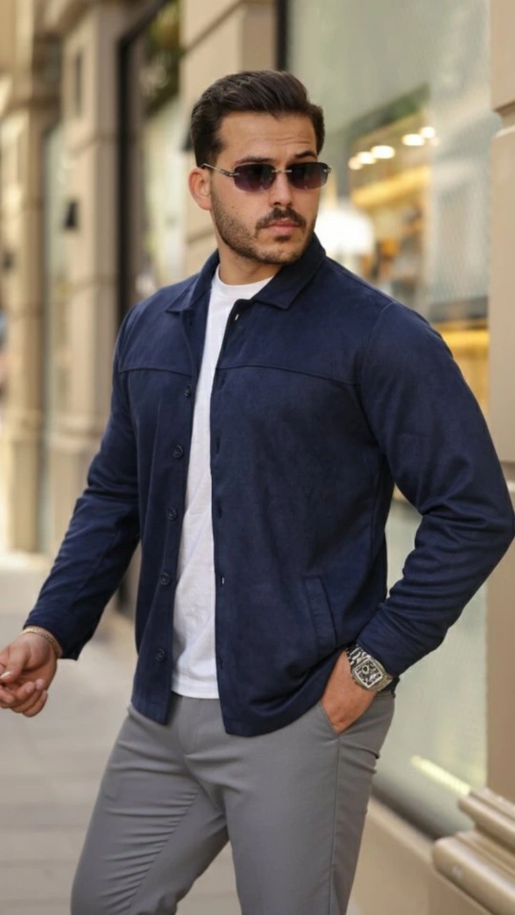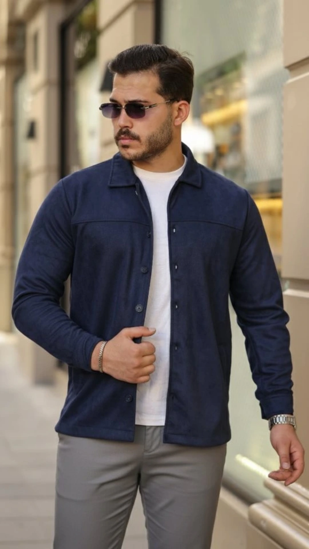 Erkek İçi Astarlı İçten Yaka Kısmı Peluşlu uni Kumaş Vintage Ceket acivert
