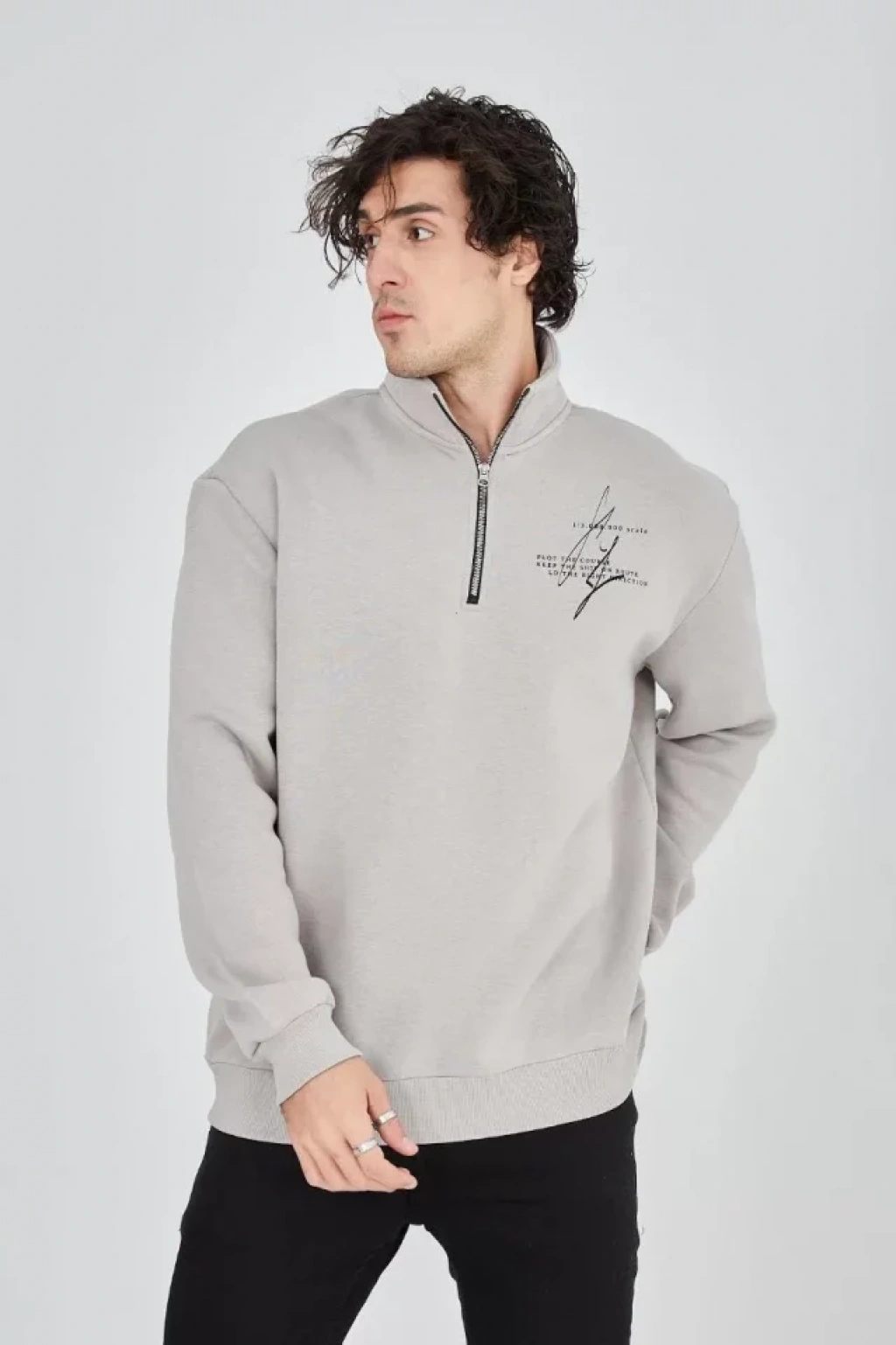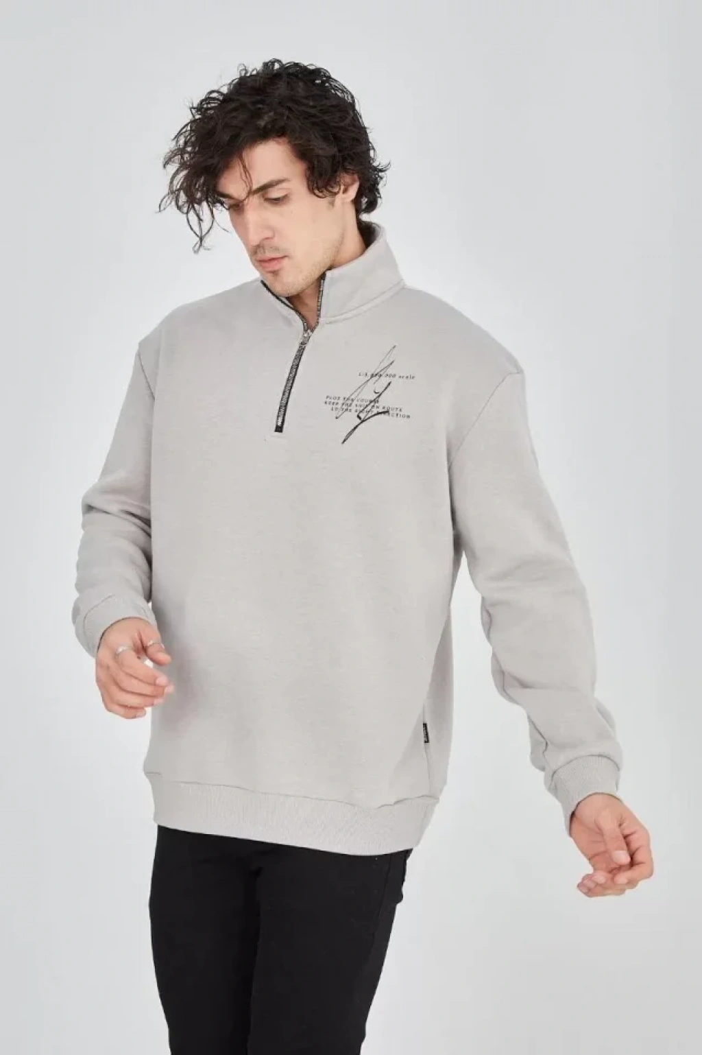 Erkek Yarım Fermuarlı Baskılı weat Boyalı Gri