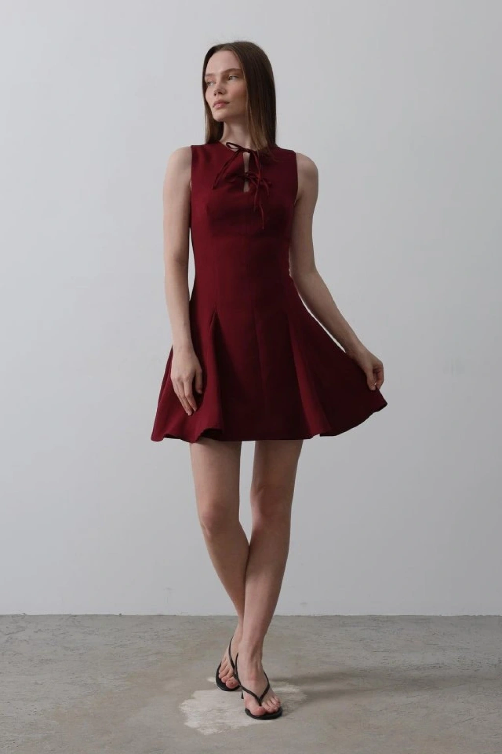 Fiyonk Detay Sıfır Kollu Mini Elbise - Bordo