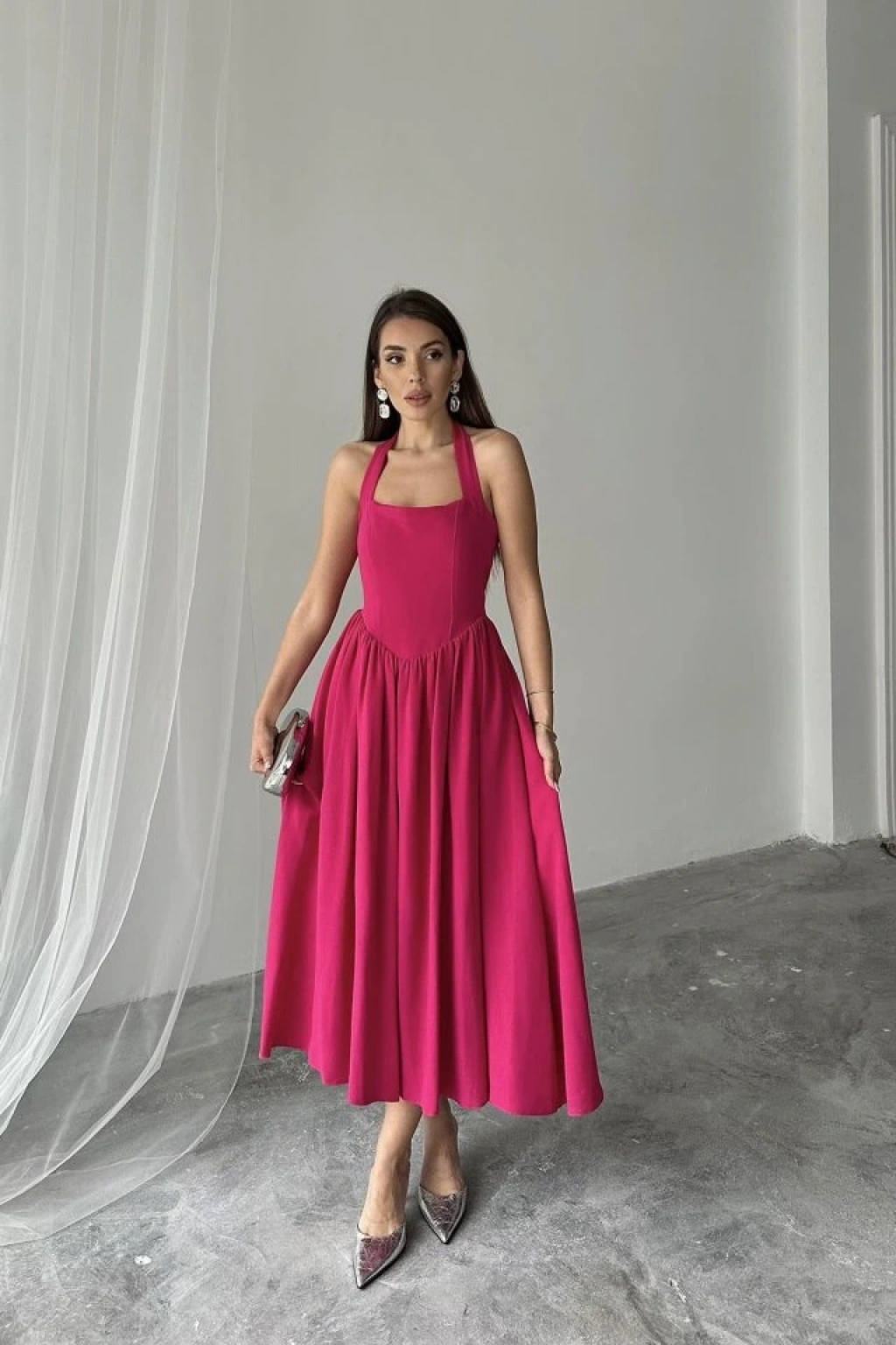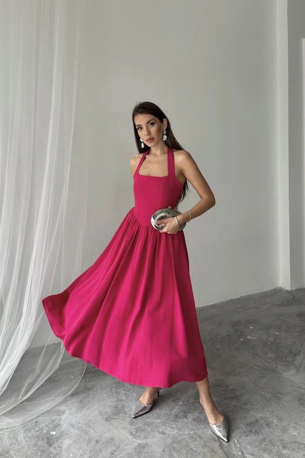 Fuşya Boyundan Bağlamalı Keten Elbise