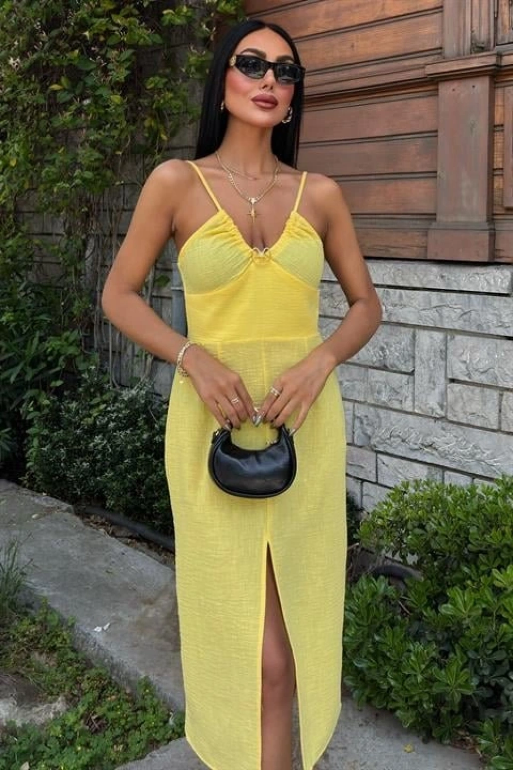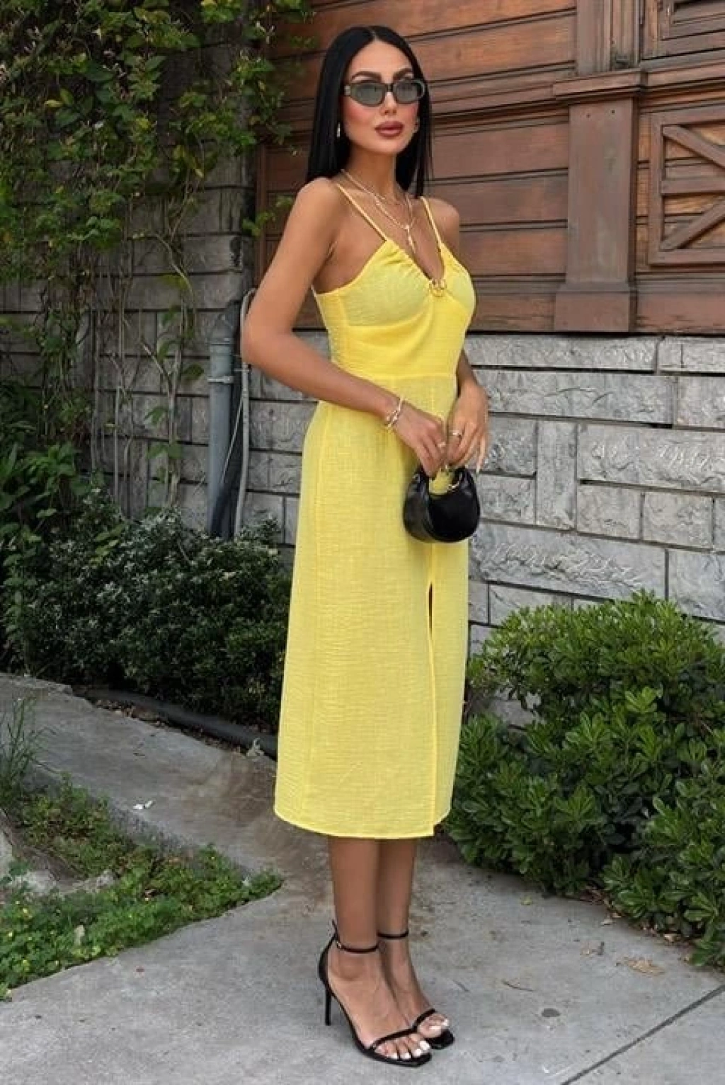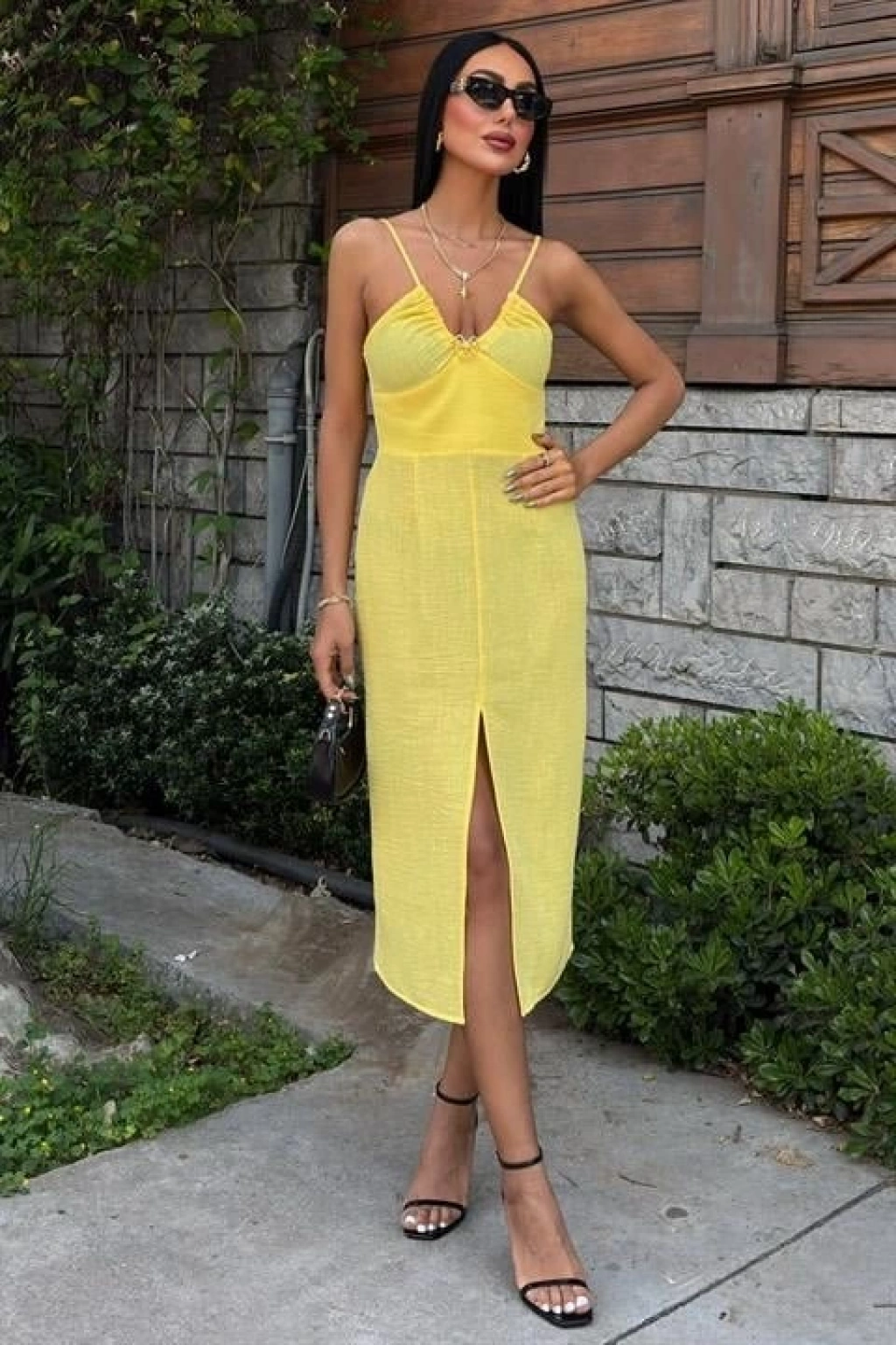 Göğsü Aksesuarlı Önü Yırtmaçlı Elbise 2899