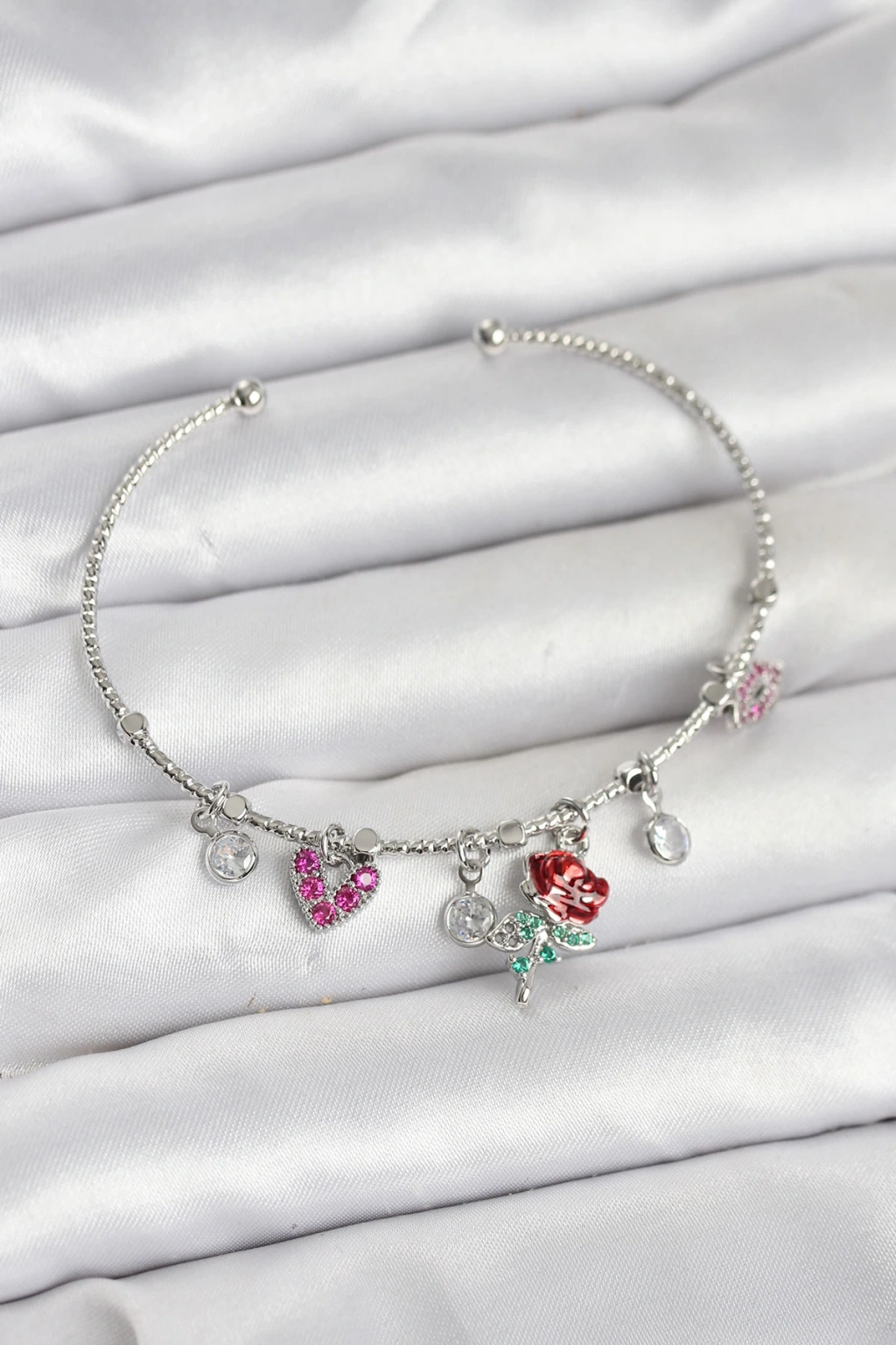 Gül Charmlı Gümüş Renk Pirinç Kadın Bileklik
