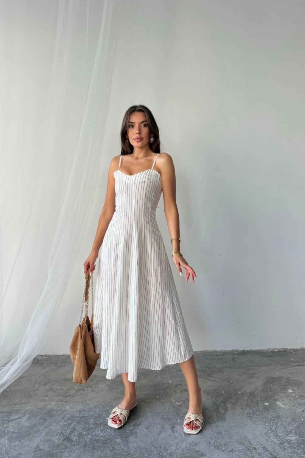 SİMLİ ÇİZGİLİ ASKILI ELBİSE MİDİ BOY - Kahverengi