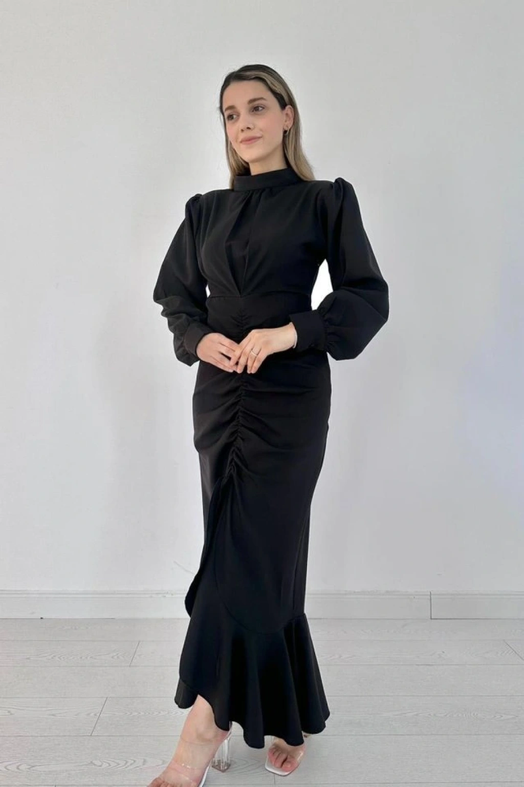 Siyah Volanlı Uzun Kol Elbise