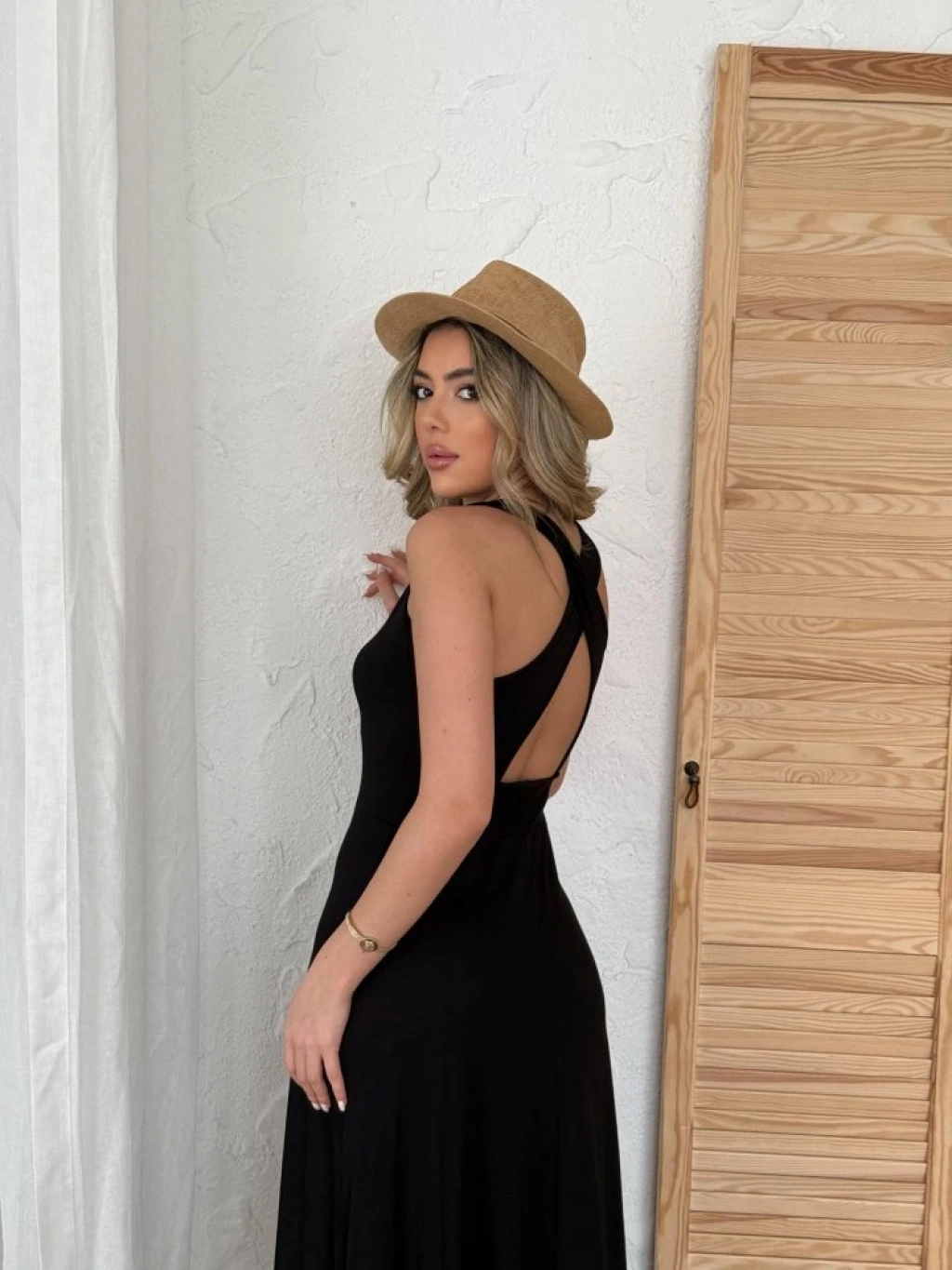Kadın Arkadan çapraz Detay Yuvarlak Yaka Maksi Viskon Elbise