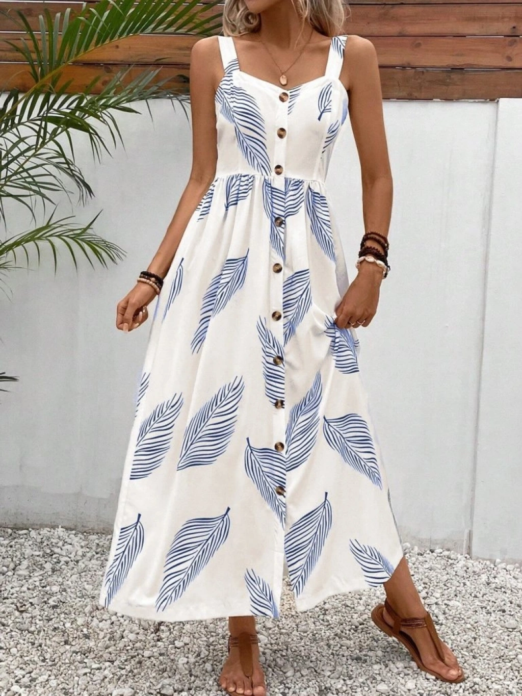 Kadın Askılı önden Düğmeli Yaprak Desenli Uzun Süprem Elbise