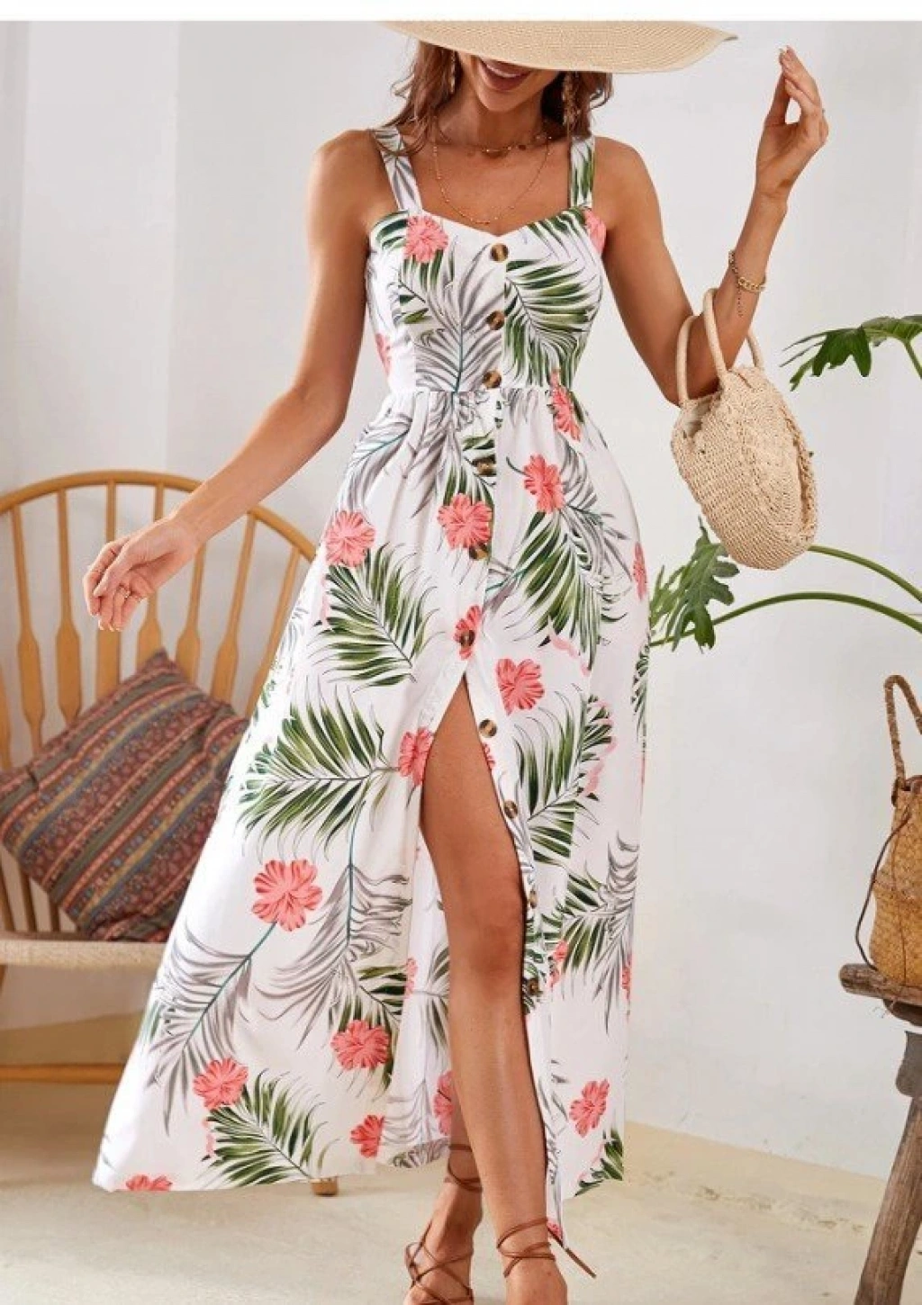 Kadın Askılı önden Düğmeli Yaprak Desenli Uzun Süprem Elbise