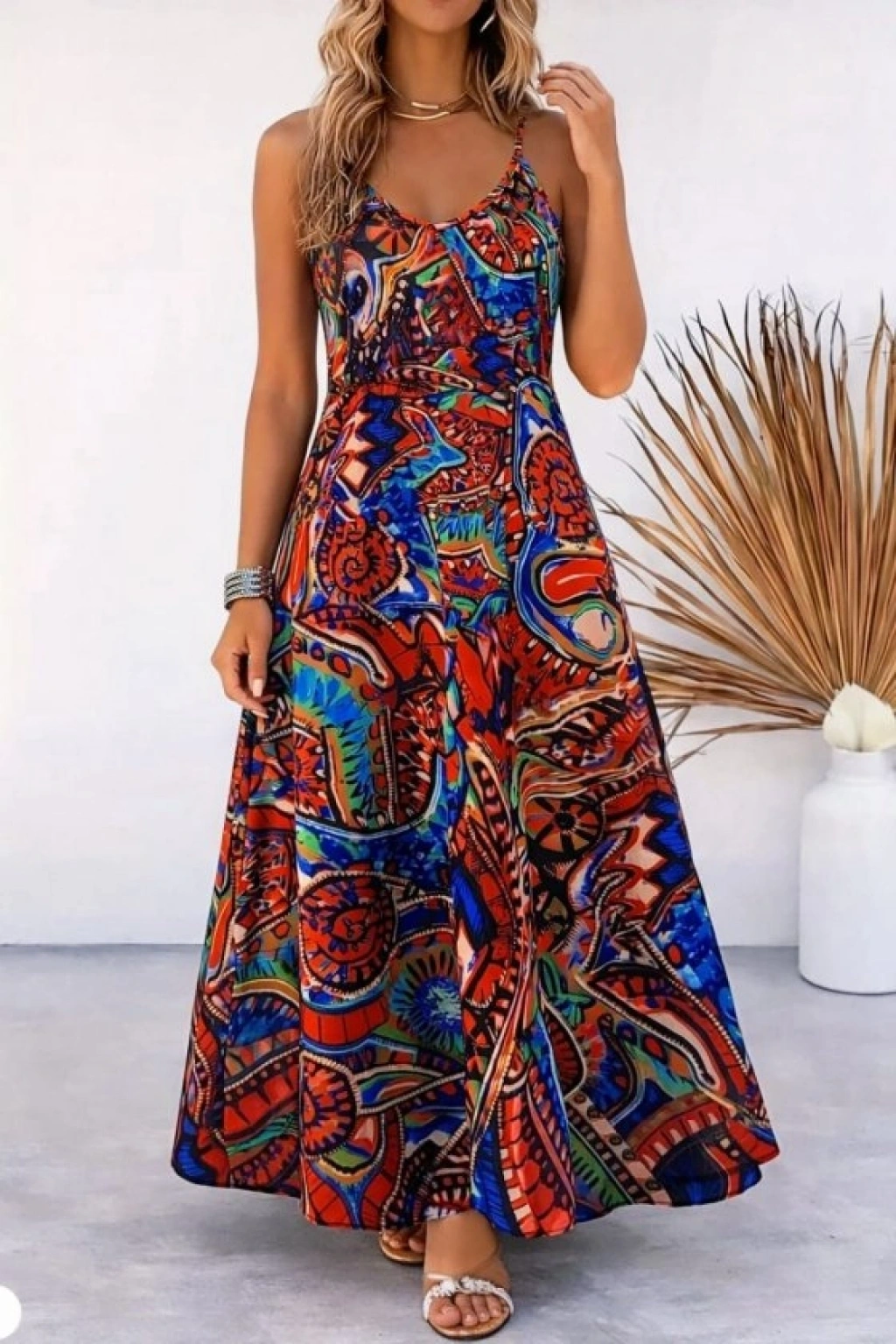 Kadın Askılı V Yakalı Desenli Uzun Süprem Elbise