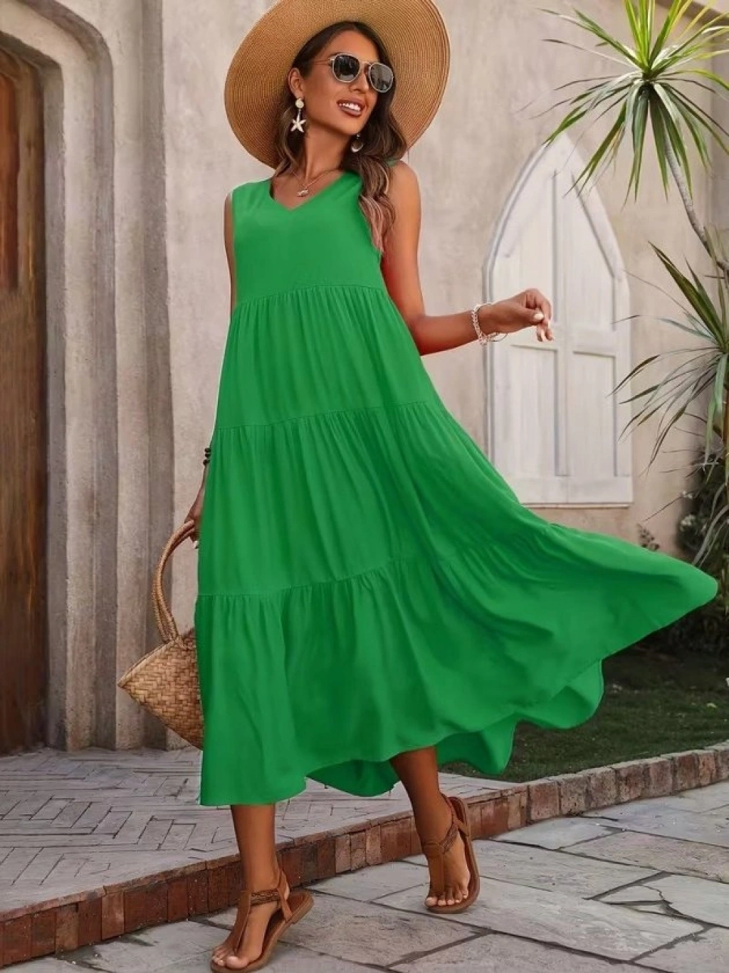 Kadın Askılı V Yakalı Uzun Dokuma Viskon Elbise