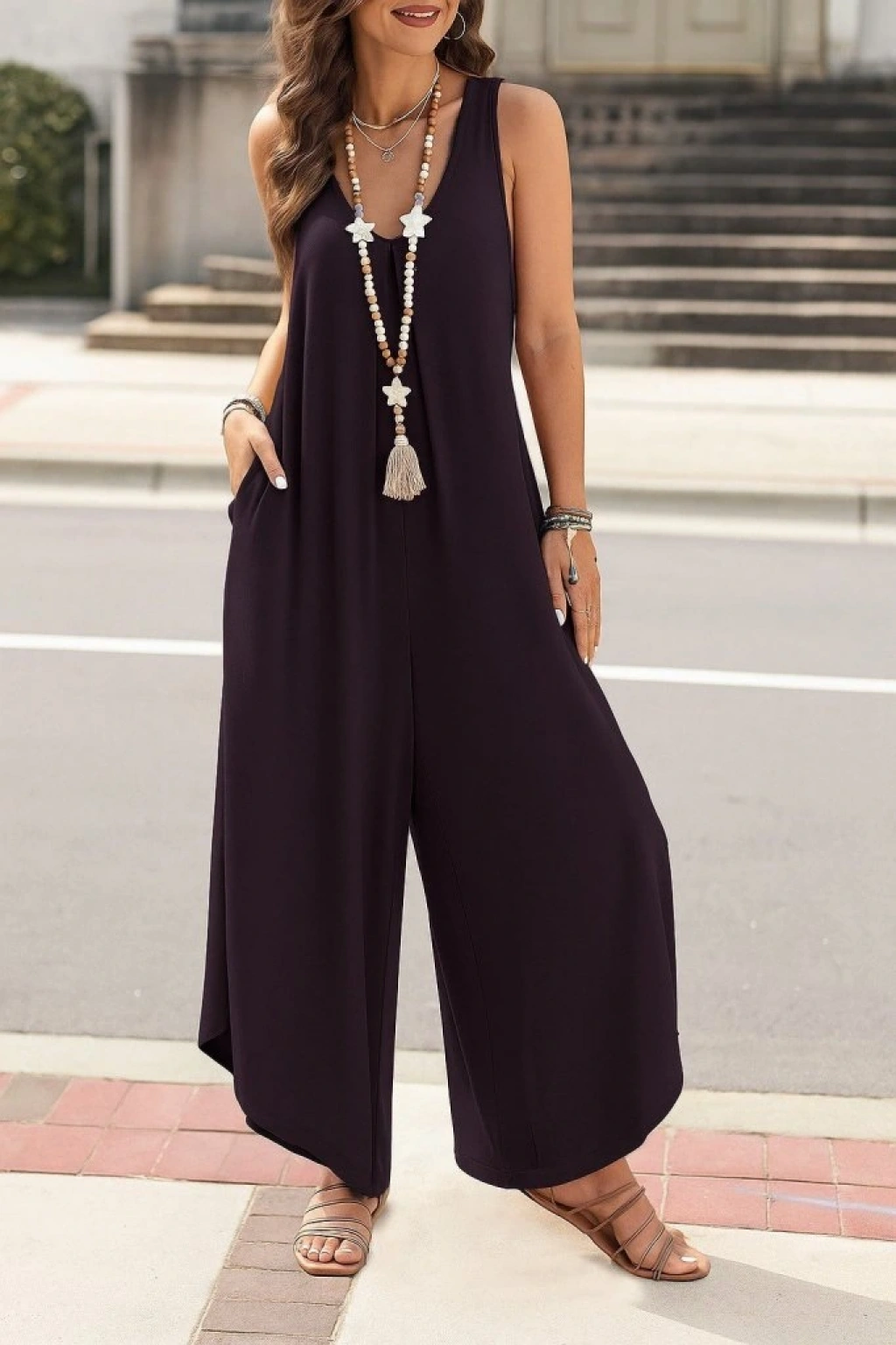 Kadın Askılı Yuvarlak Yaka Cepli Salaş Uzun Viskon Tulum