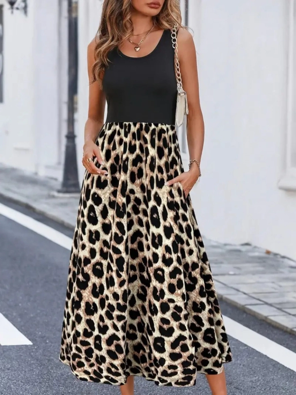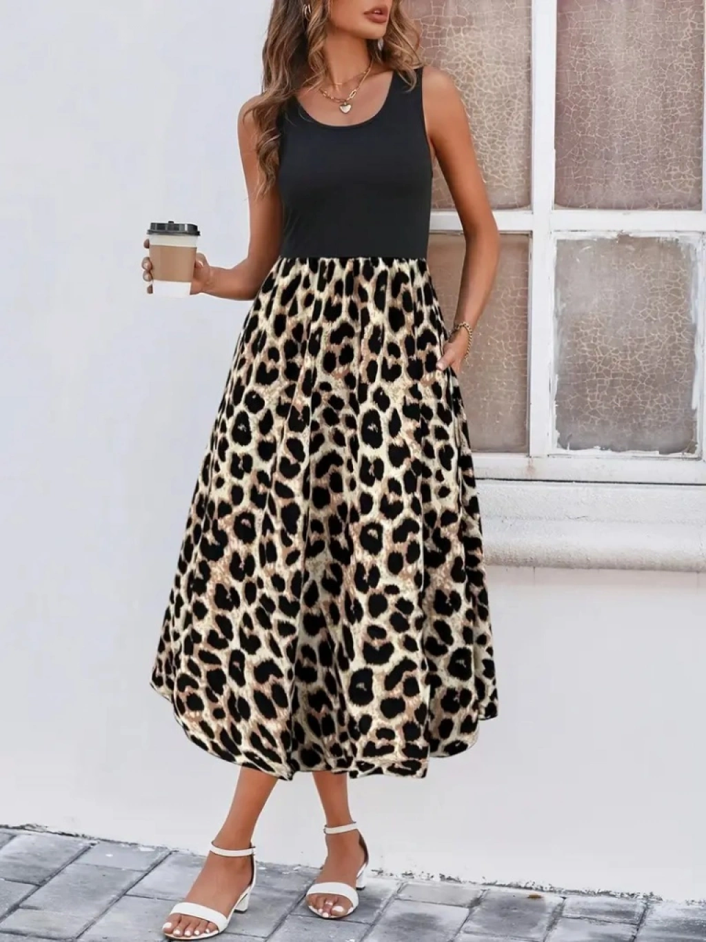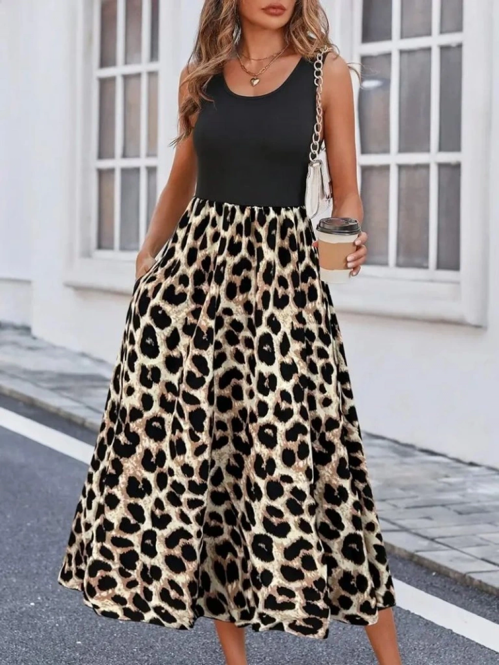 Kadın Askılı Yuvarlak Yaka üst Viskon Alt Leopar Desenli Süprem Uzun Elbise