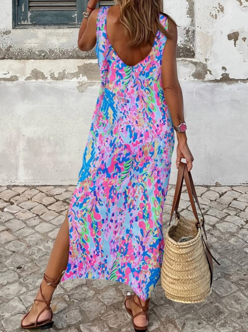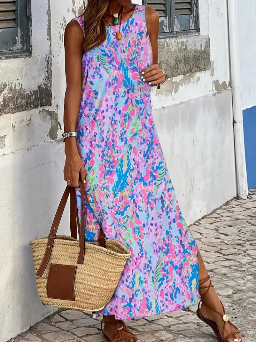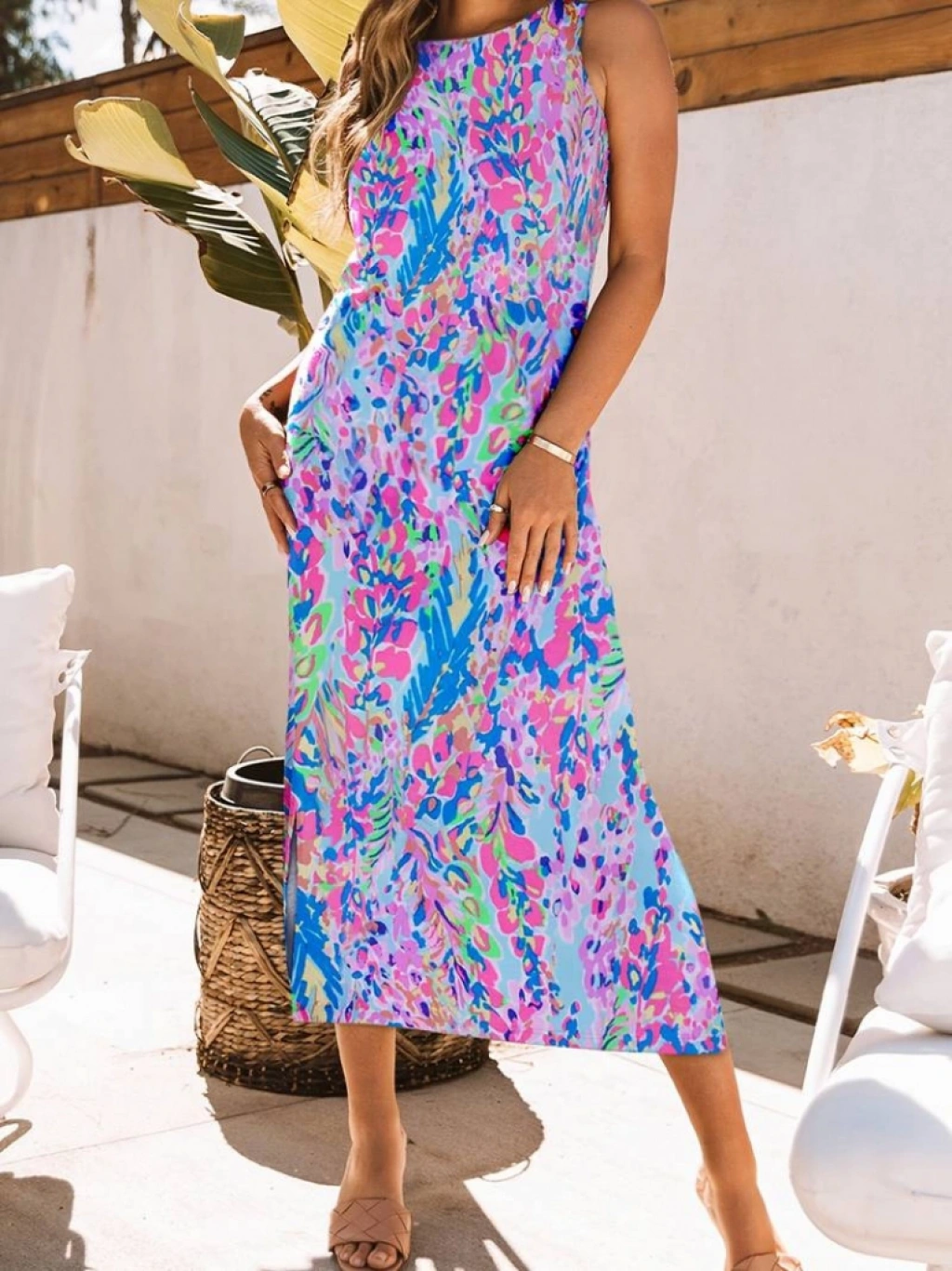 Kadın Askılı Yuvarlak Yaka Yandan Yırtmaçlı Uzun Süprem Elbise