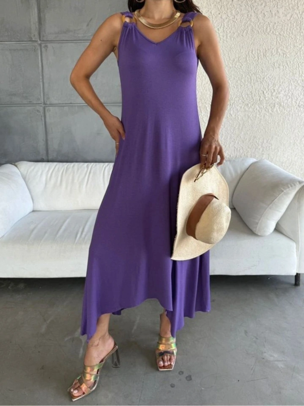 Kadın çan Dokuma Kumaş V Yaka Asimetrik Kesim Elbise