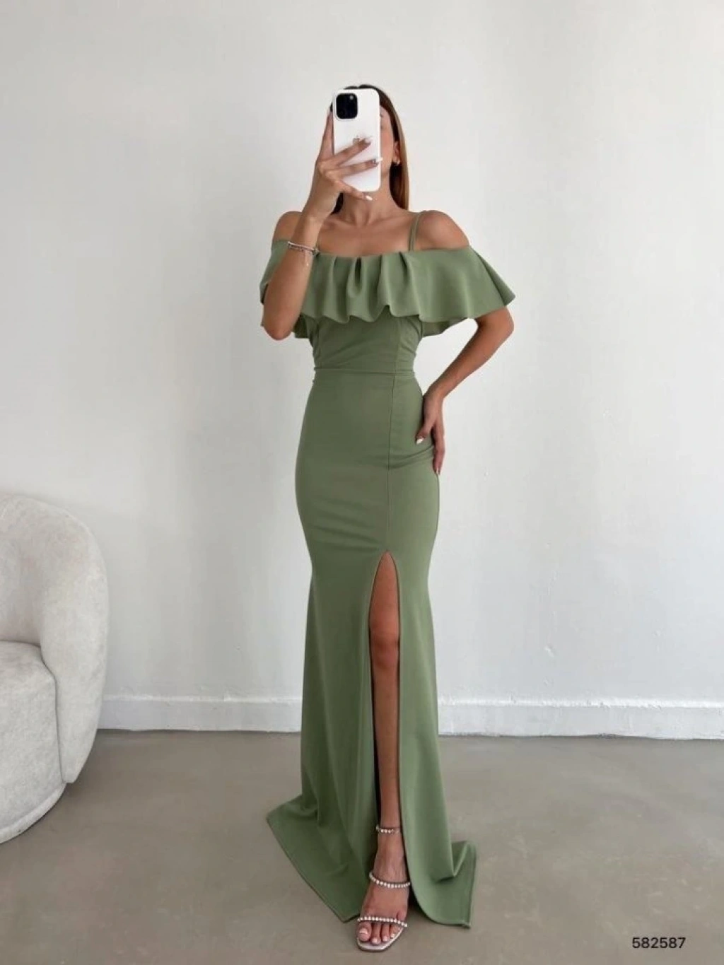 Kadın Dalgıç Krep Yırtmaç Detaylı Askılı Maxi Boy Elbise