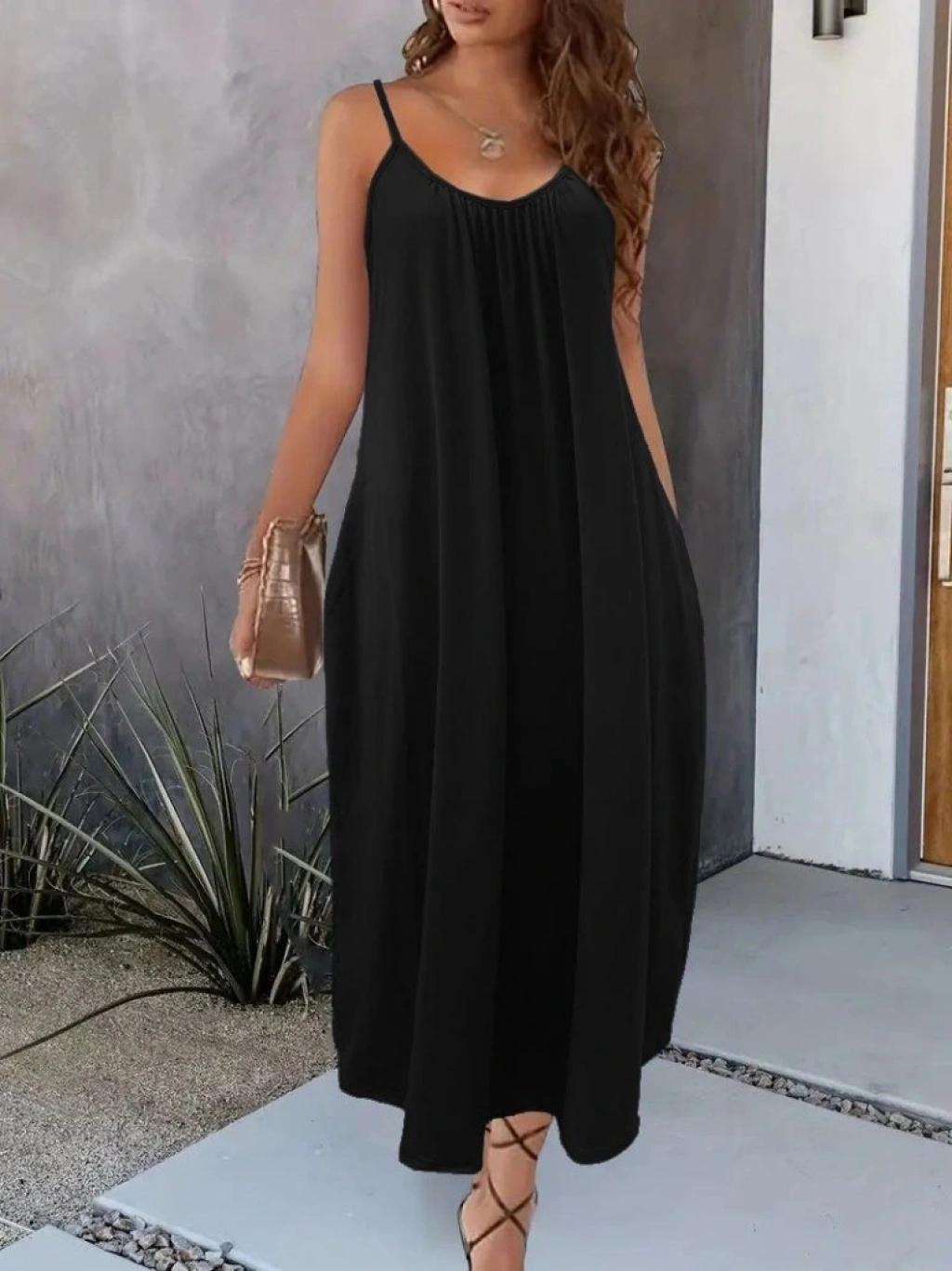 Kadın Ip Askılı Geniş V Yakalı Viskon Elbise