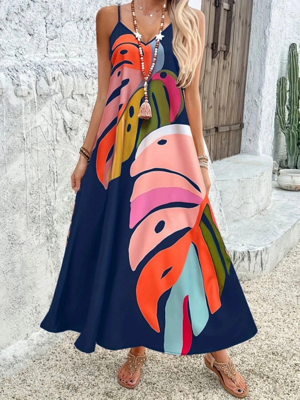 Kadın Ip Askılı V Yakalı Desenli Süprem Maxi Elbise