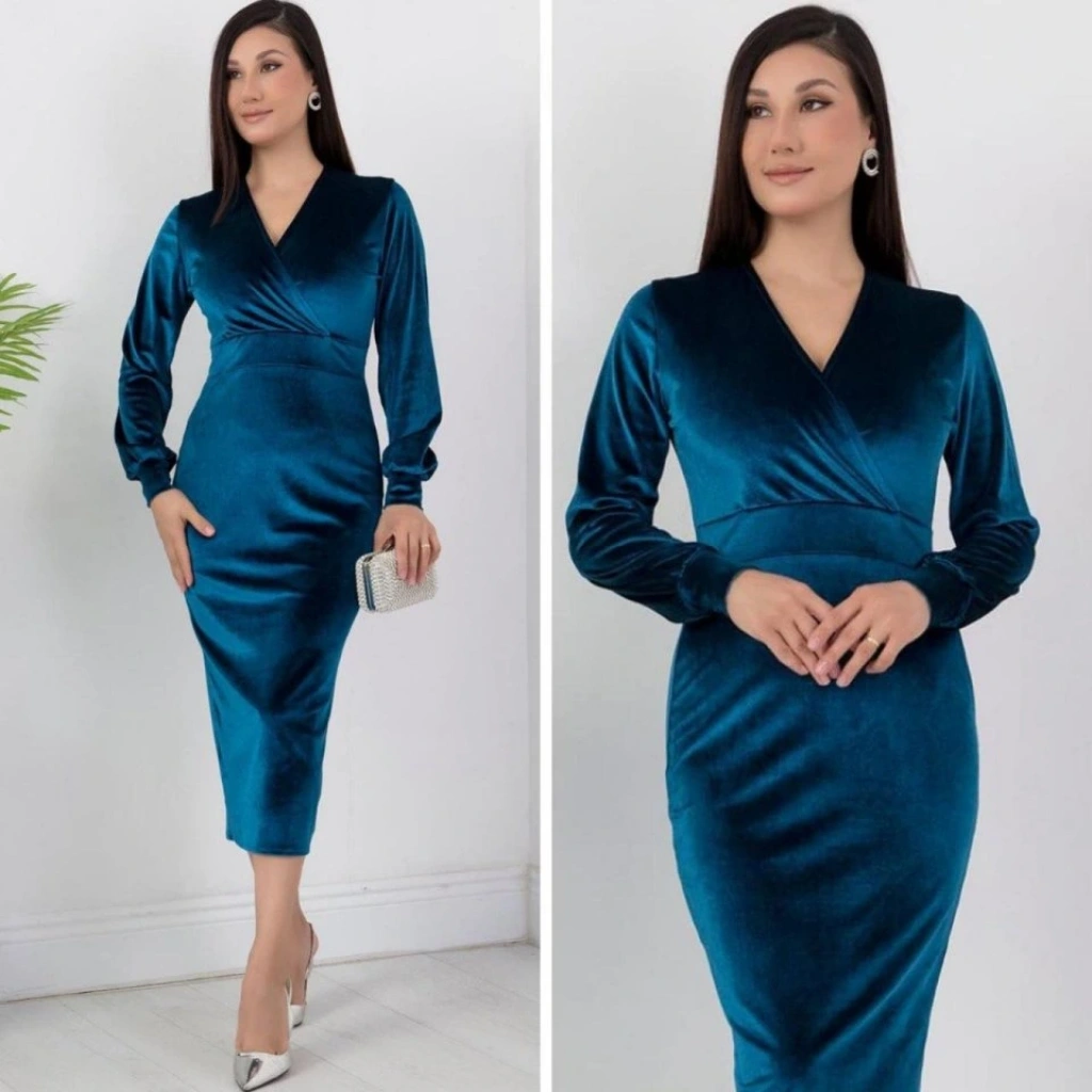 Kadın Kadife Kumaş Manşetli V Yaka Şık Kalem Elbise