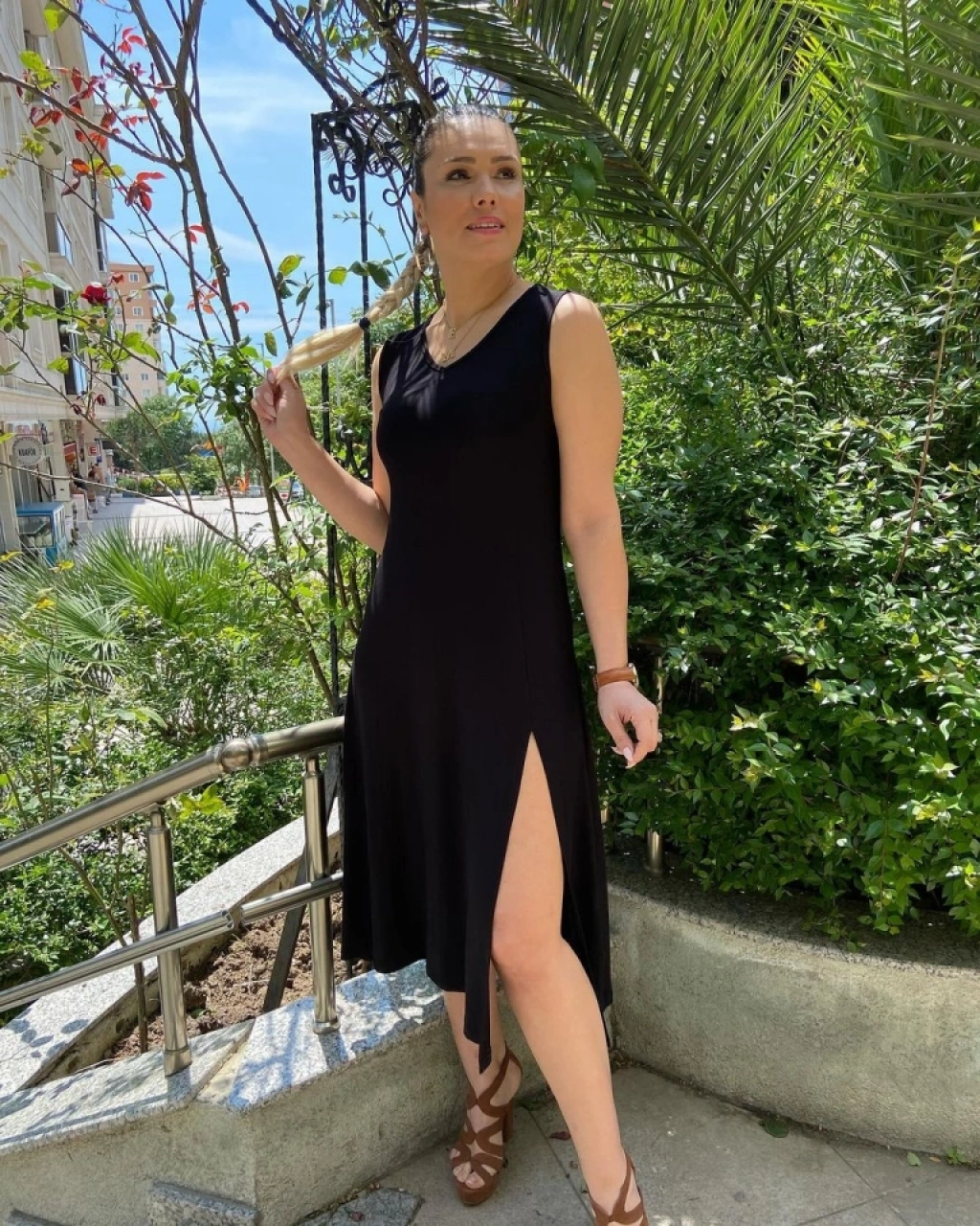 Kadın Kalın Askılı V Yaka Yırtmaç Detay Viskon Elbise