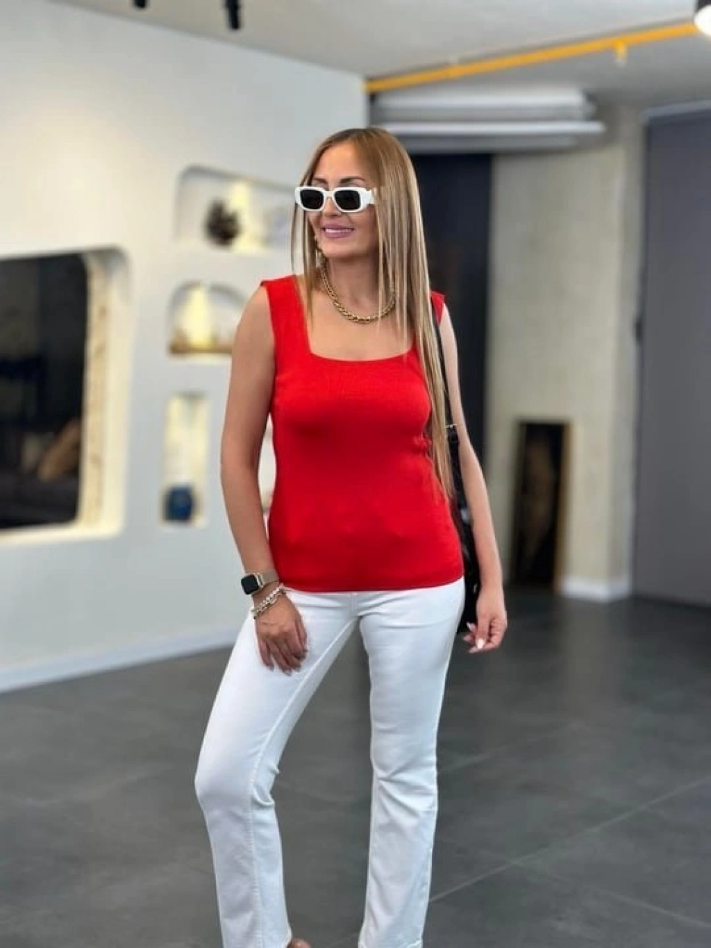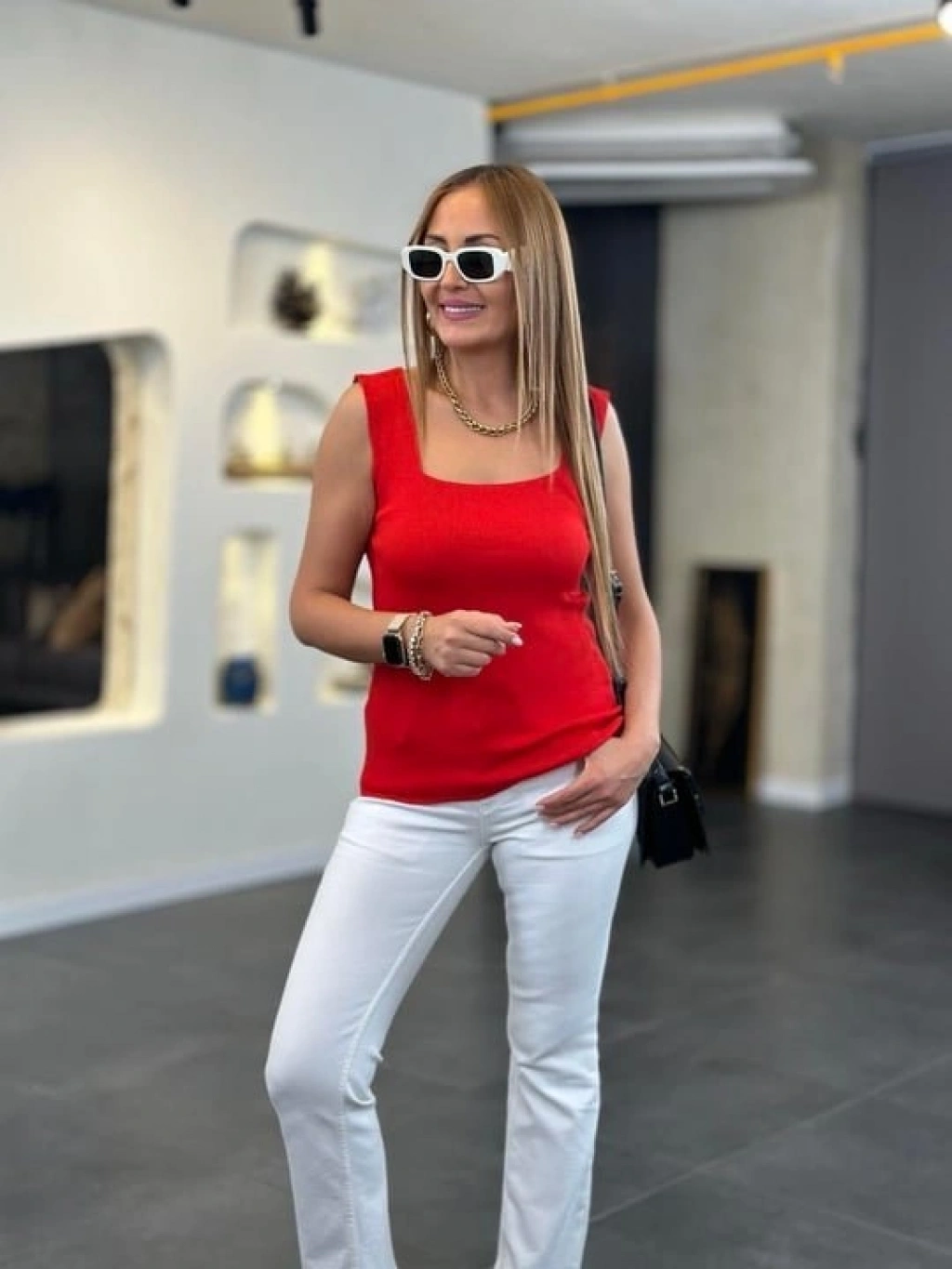 Kadın Kare Yaka Kalın Askılı Beyaz Triko Bluz