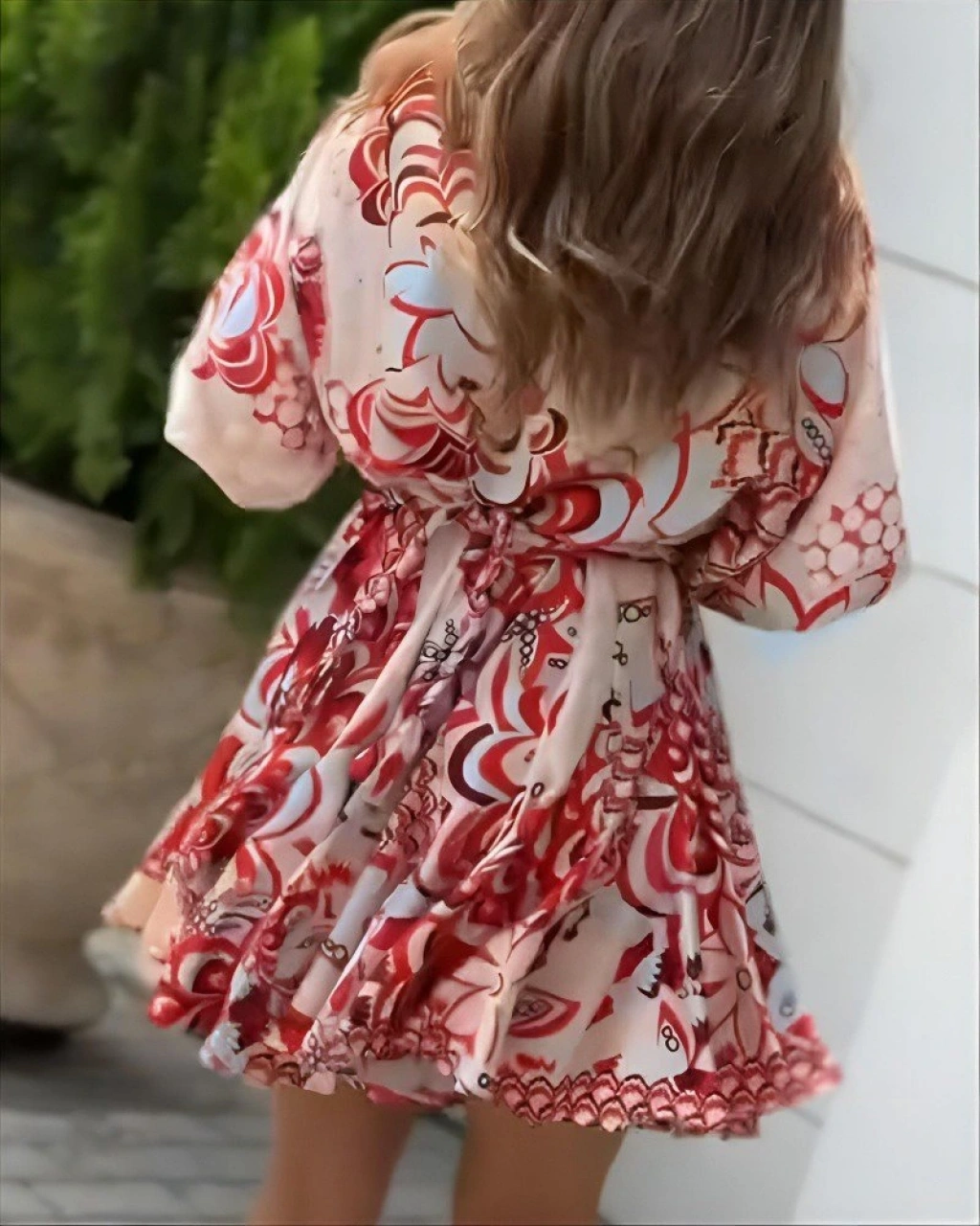 Kadın Kısa Balon Kollu Yuvarlak Yakalı Pileli Desenli Mini Elbise