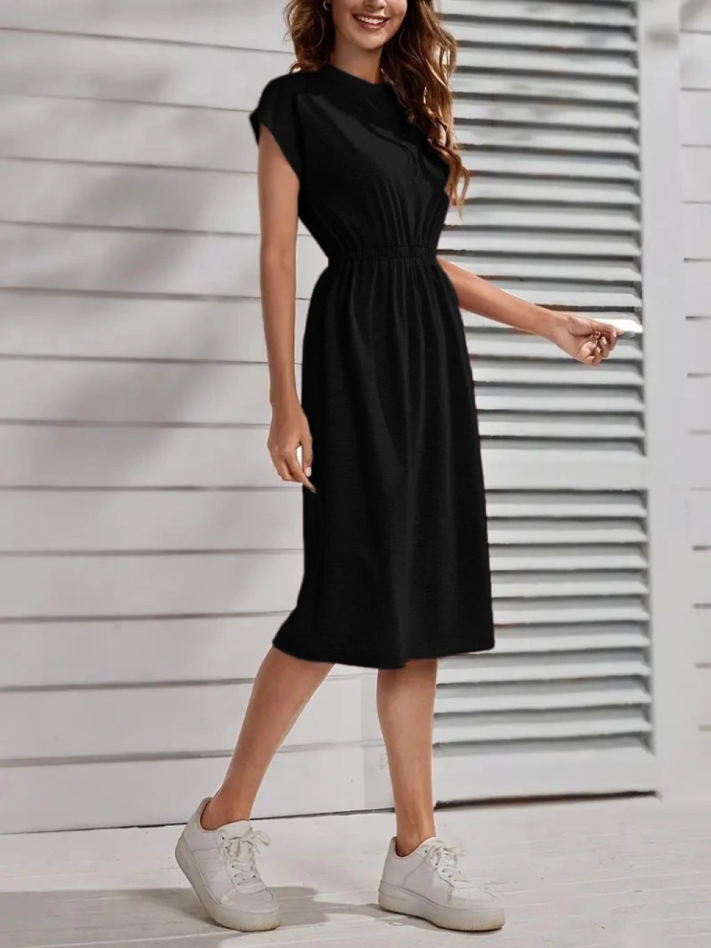 Kadın Kısa Kollu Bisiklet Yaka Belden Lastikli Midi Viskon Elbise
